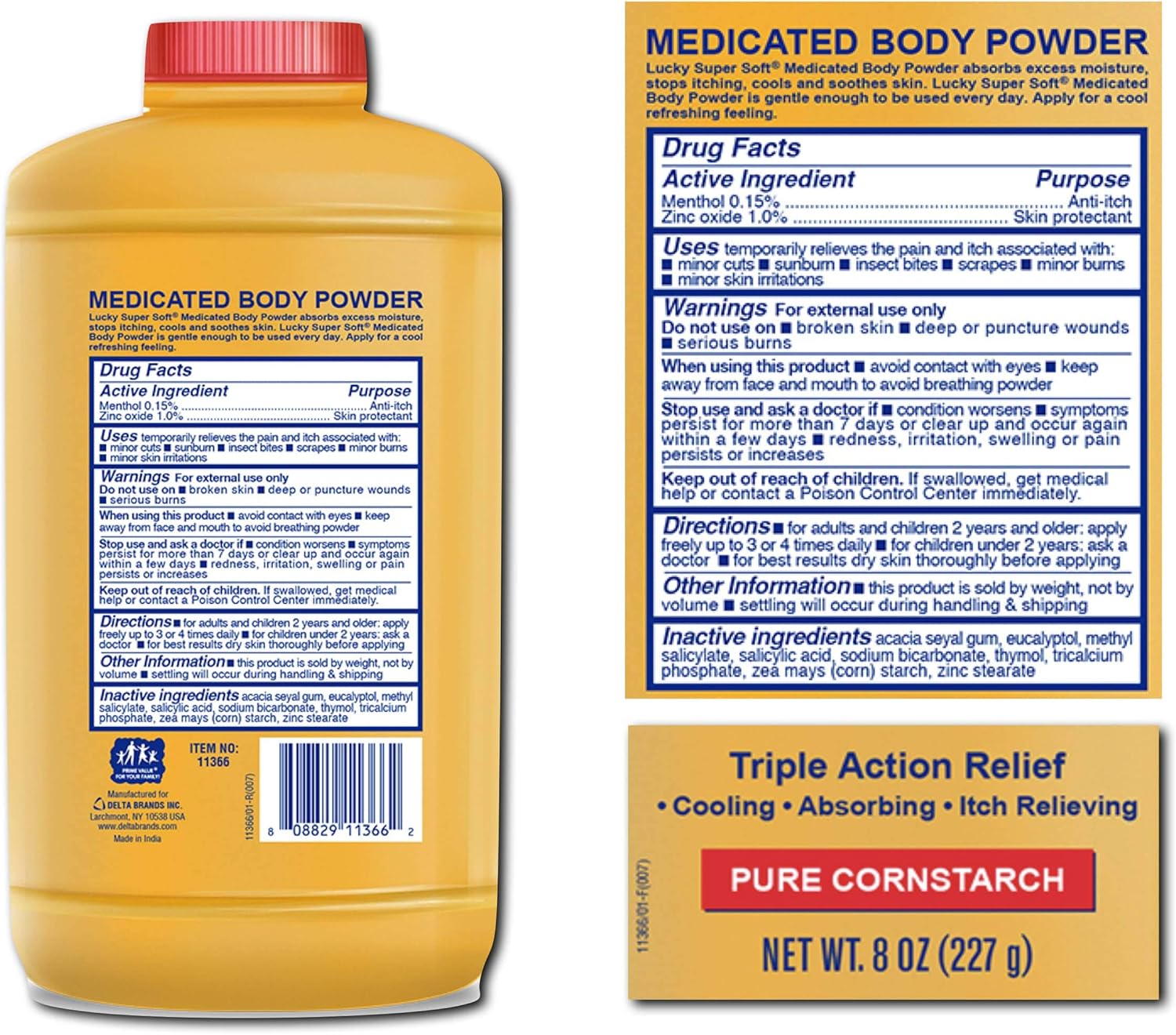 2 laptop Physique Powder Medicated 8 oz Cooling Itch Triple Motion Reduction 100 % Talc-Free Set of two Medicated Physique Powder bottles, 8 oz every (227g). Fortunate Tremendous Smooth absorbs extra moisture. Stops itching, cools and soothes pores and skin. Light sufficient for use daily. Apply for a cool refreshing feeling. Energetic elements: Menthol 0.15 % Goal: Anti-itch Zinc oxide 1.0 % . Goal: Pores and skin protectant Cornstarch Powered with Zin Oxide and Menthol With cornstarch and zinc oxide, get a protecting barrier to repel moisture and assist maintain pores and skin dry. This light powder is acknowledged as protected and efficient by mothers and medical doctors in treating diaper rash, prickly warmth, and chafing. Odor neutralizing elements to soak up sweat and moisture. Use this Triple Motion Physique Powder wherever you want a little bit freshness, consolation, and moisture management. Sweaty and itchy pores and skin wants sturdy reduction. Better of all, this extra-strength cooling and itch relieving powder is light sufficient to make use of every day when used as directed.
