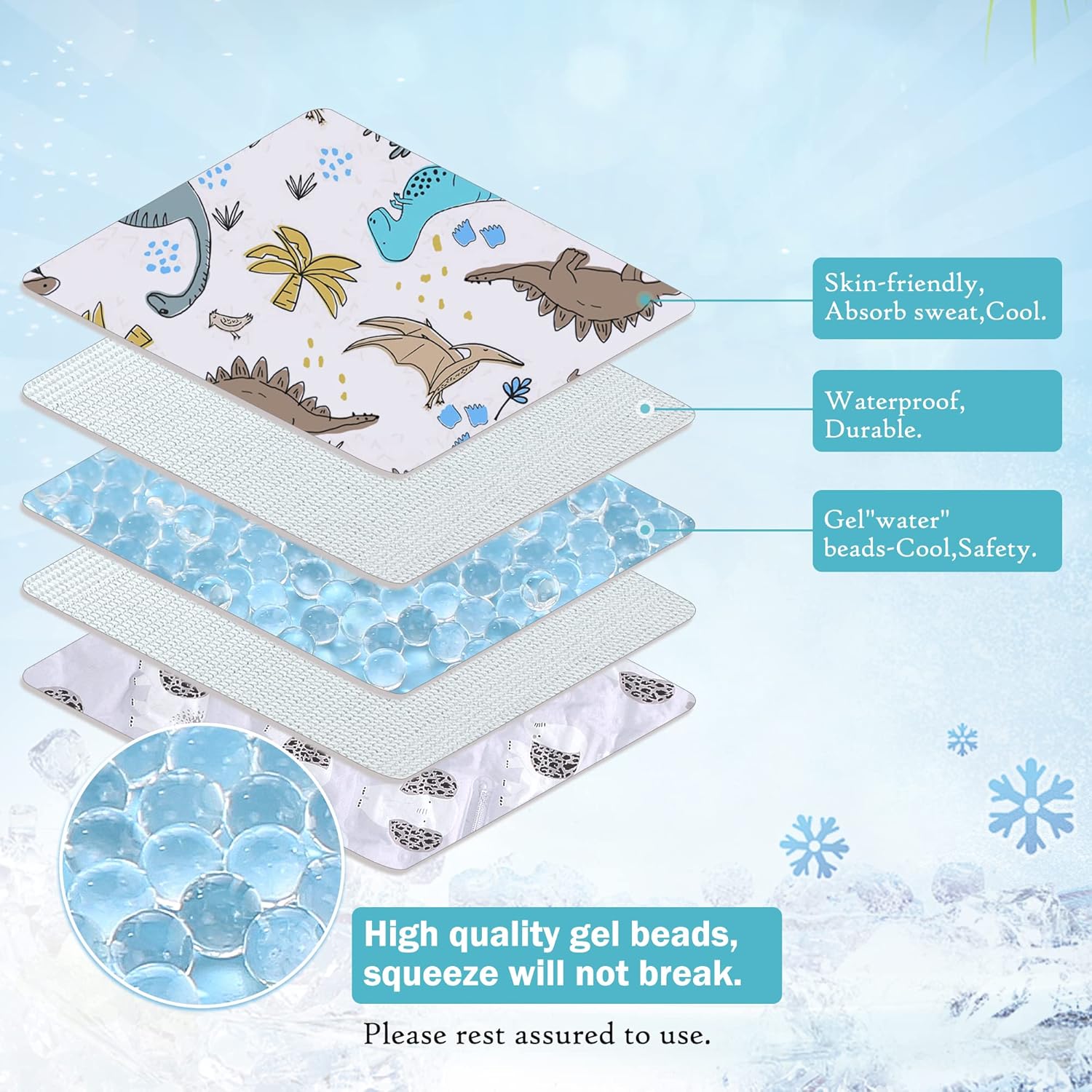 COMFORTABLE AND SAFETY MATERIAL:Each side of the Cooler Mat are made of soppy, skin-friendly polyester ,which is non-irritating to the infant’s delicate pores and skin.Waterproof,Cozy ,sweat-absorbent, and sturdy.Inside full with Top quality gel beads,Is elastic and breathable.Solely put the Cooler Pad into fridge for a couple of minutes, and it may be cool for a very long time.