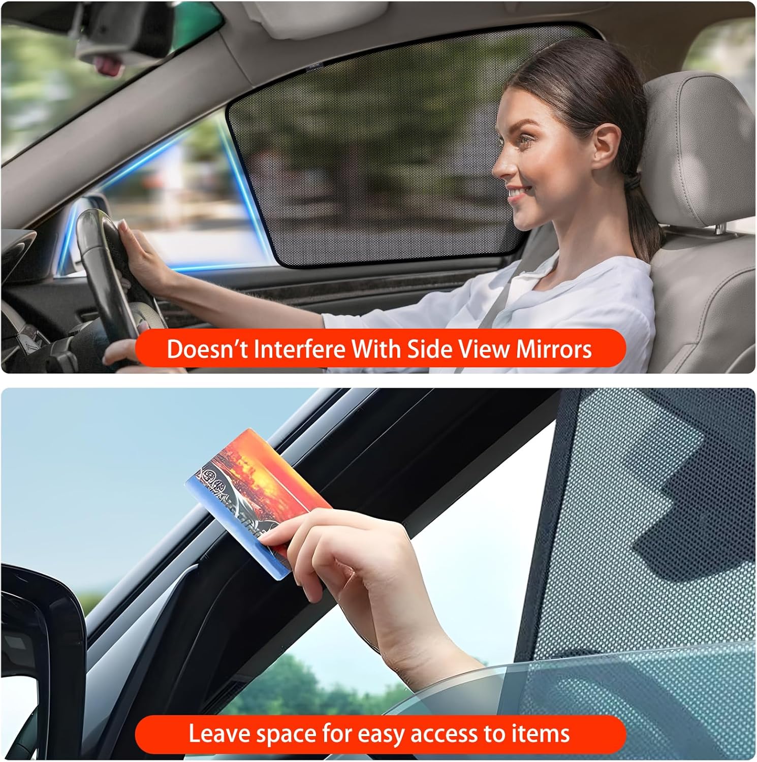 Simple Set up: Outfitted with robust magnetic attachments, these sunshades might be effortlessly put in on entrance and rear home windows. For home windows the place magnets received’t work, adhesive fasteners make sure the shades keep securely in place, even on windy days, making them a dependable accent to your automotive