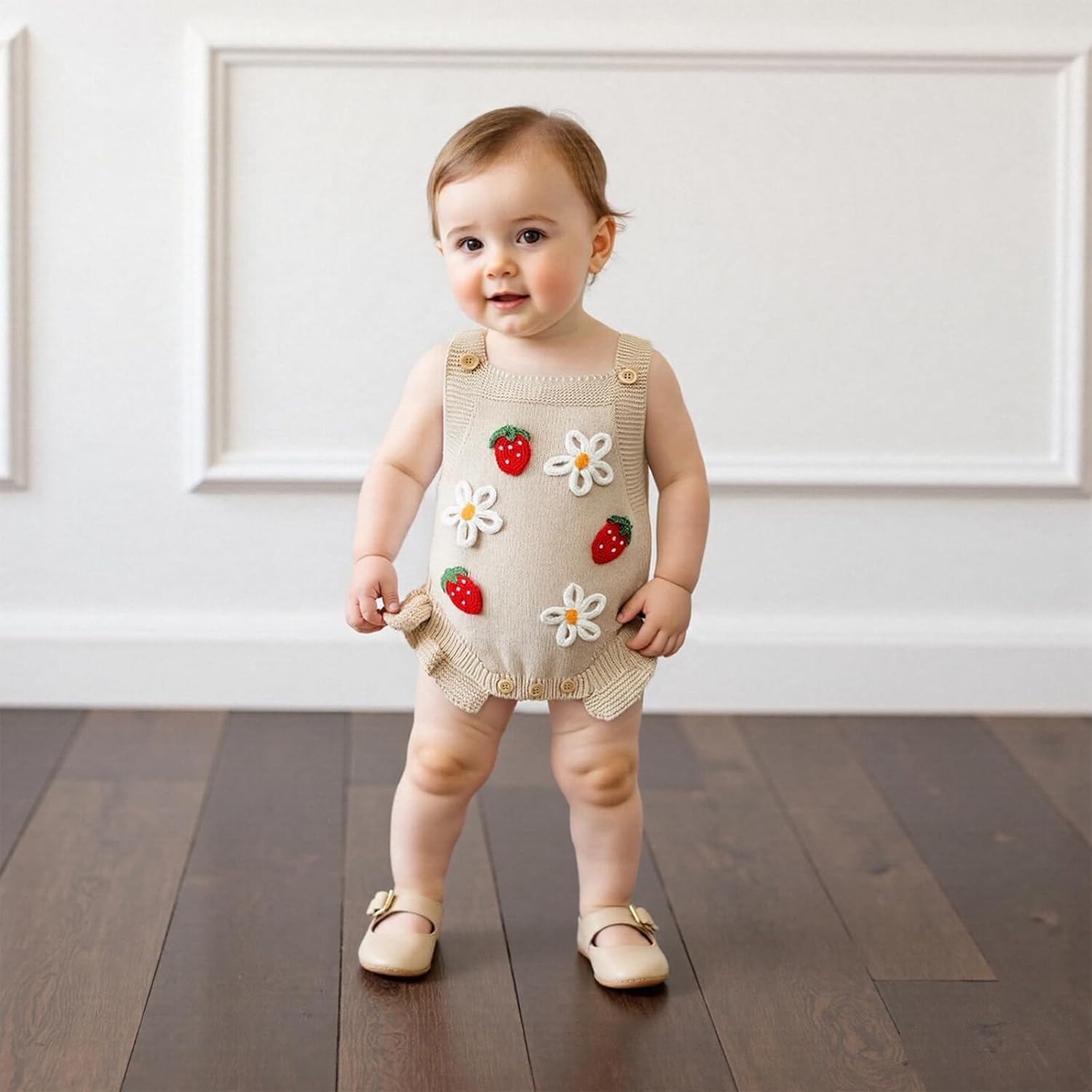 Child Woman Knit Romper Crochet Flower Strawberry Sleeveless Sq. Neck Jumpsuit Sweater Bodysuit
