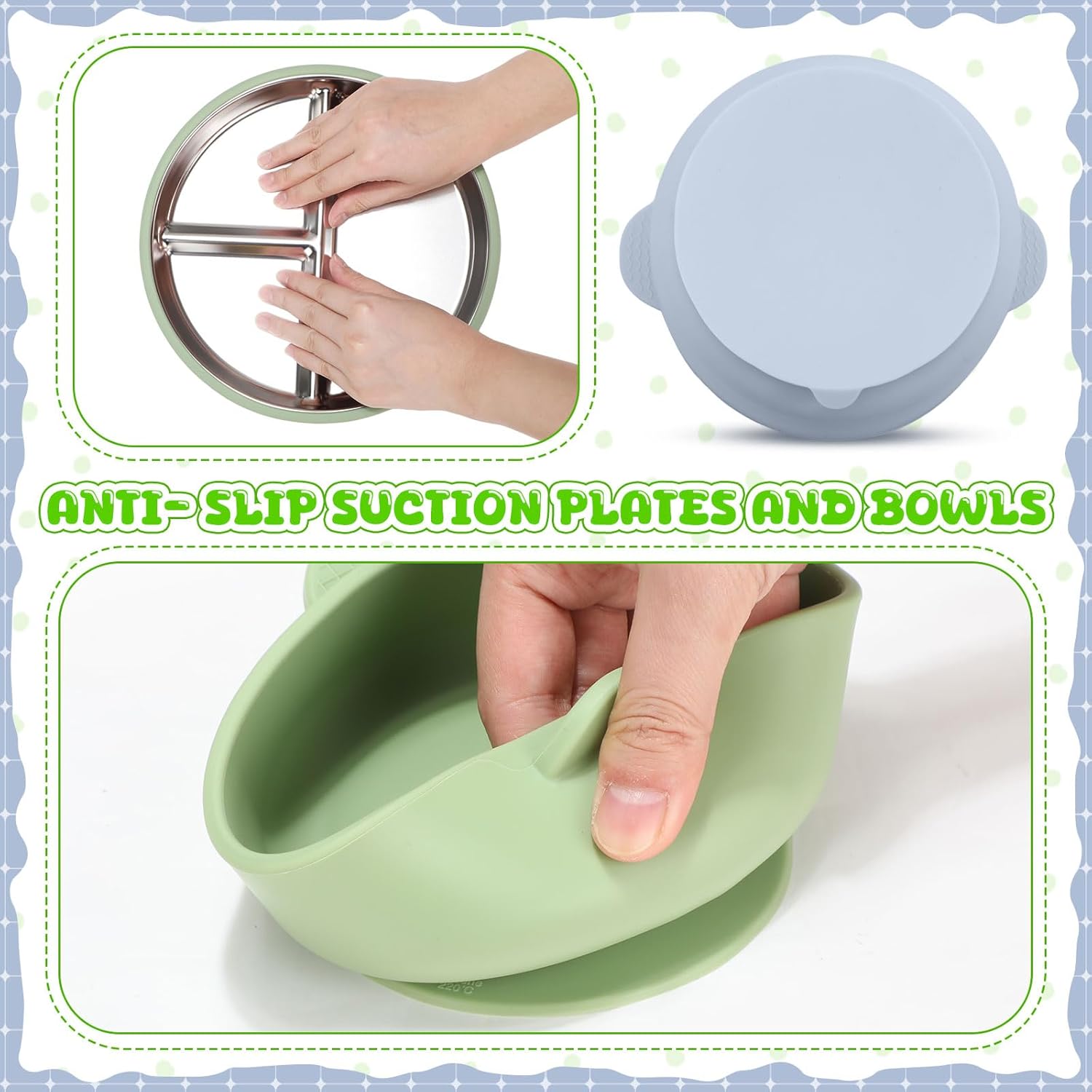 Suction Base and Vibrant Colours: sturdy suction bottoms maintain the non poisonous youngsters plates and bowls firmly in place, stopping messes and tipping accidents; With 2 cheerful colour choices, gentle inexperienced and lightweight blue; Tthese mealtime instruments make consuming enjoyable and visually stimulating, serving to toddlers keep targeted whereas growing motor abilities and coordination; All merchandise adjust to CPC requirements; Please use them with confidence