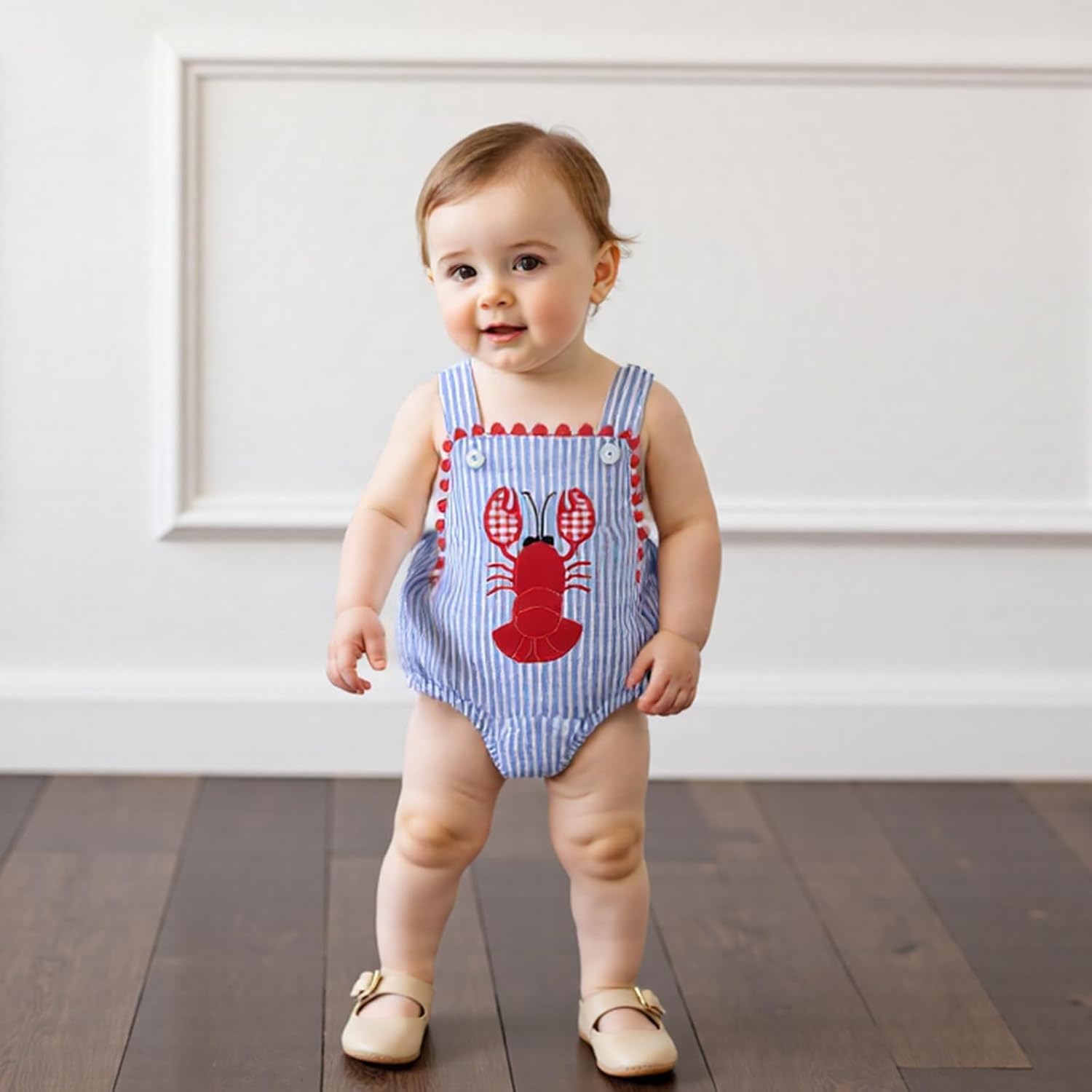Child Romper for Summer time Free Match Lobster Embroidery Striped Crew Neck Sleeveless Toddler Jumpsuit