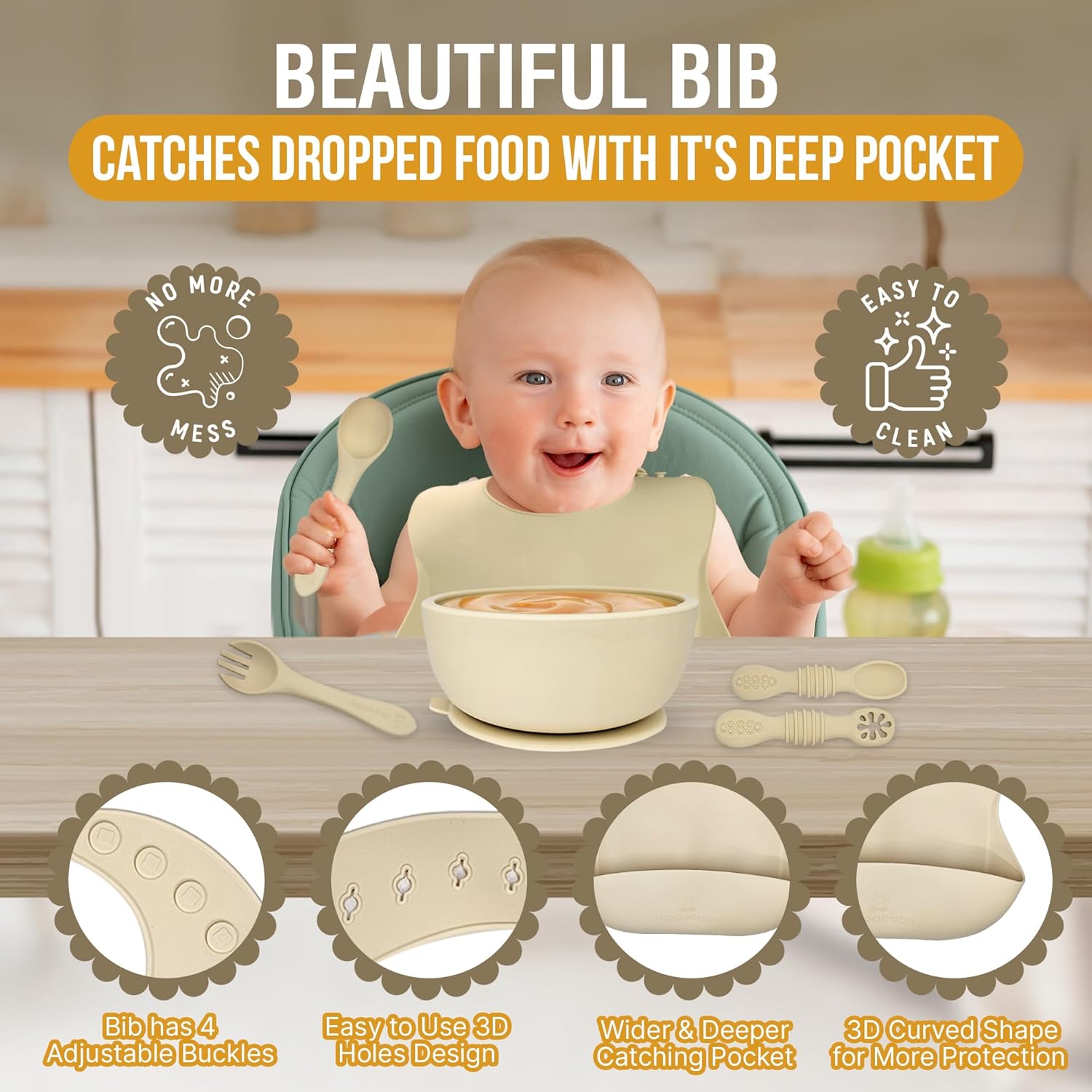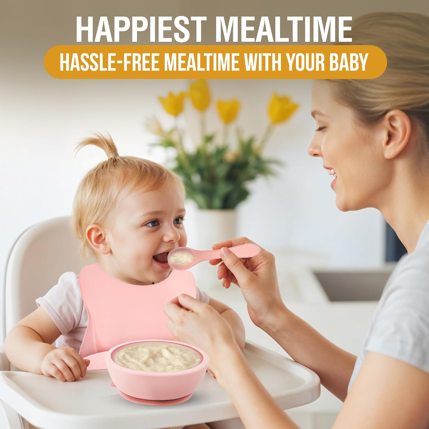 HAPPY & MESS-FREE MEAL TIMES: Our child suction bowl with suction firmly keep on with any clean surfaces, so that you don’t have to fret about your toddler tipping over the bowl, creating spills and messes. The adjustable child bib has a large food-catching pocket that successfully catches spills to maintain your child’s garments and surrounding clear.