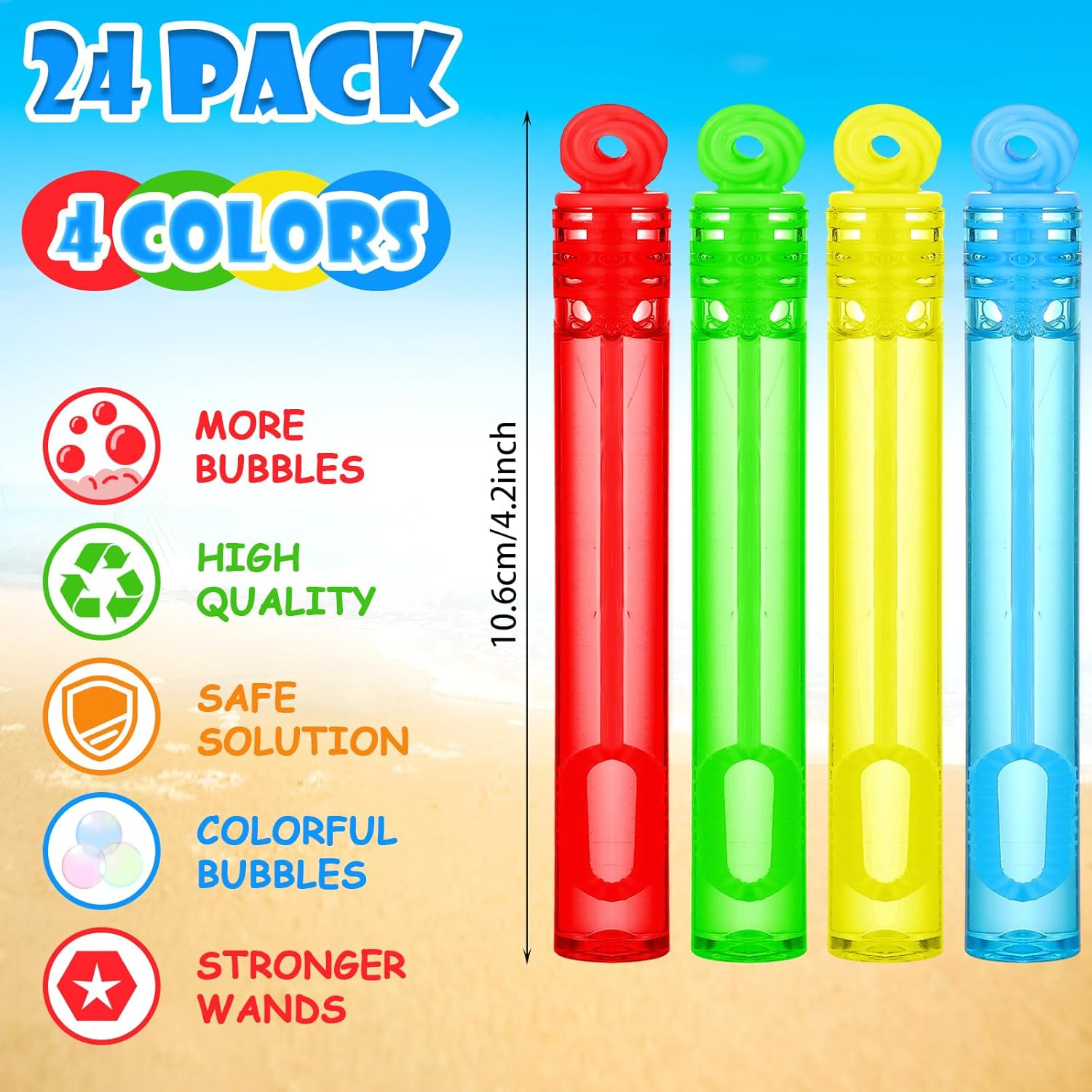 Brimming with enjoyable, our seashore toys set is a colourful combo of crimson, blue, yellow, and inexperienced. Your buy consists of 24 sturdy plastic seashore buckets (5.91 inches prime diameter, 4.33 inches backside diameter, and 4.33 inches peak), 24 seashore shovels (7.68 inches), 24 vibrant pairs of plastic sun shades (4.92 inches), and 24 mini bubble wands (4.17 inches). Mates will love the 24 coated paper stickers too, all sized at about 3.15 x 3.15 inches.