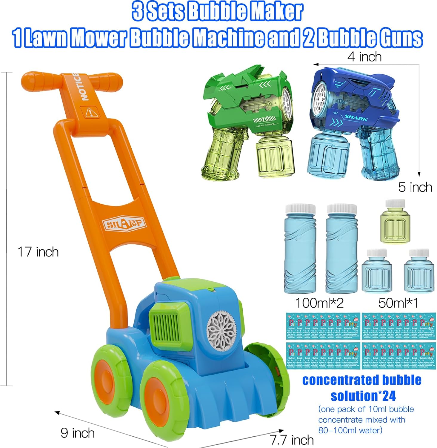 Tremendous Worth Pack : bubble machine set that includes 1 bubble garden mower, 2 bubble weapons, 5 bottles bubble resolution( 2*100 ml (3.5 oz) + 3*50ml(1.7 oz) ) and 24 packs of 10 ml concentrated bubble resolution(10ml(0.34oz))for a bubbly extravaganza. Simply insert AA batteries (Batteries not included), and watch it produce a barrage of gorgeous bubbles.