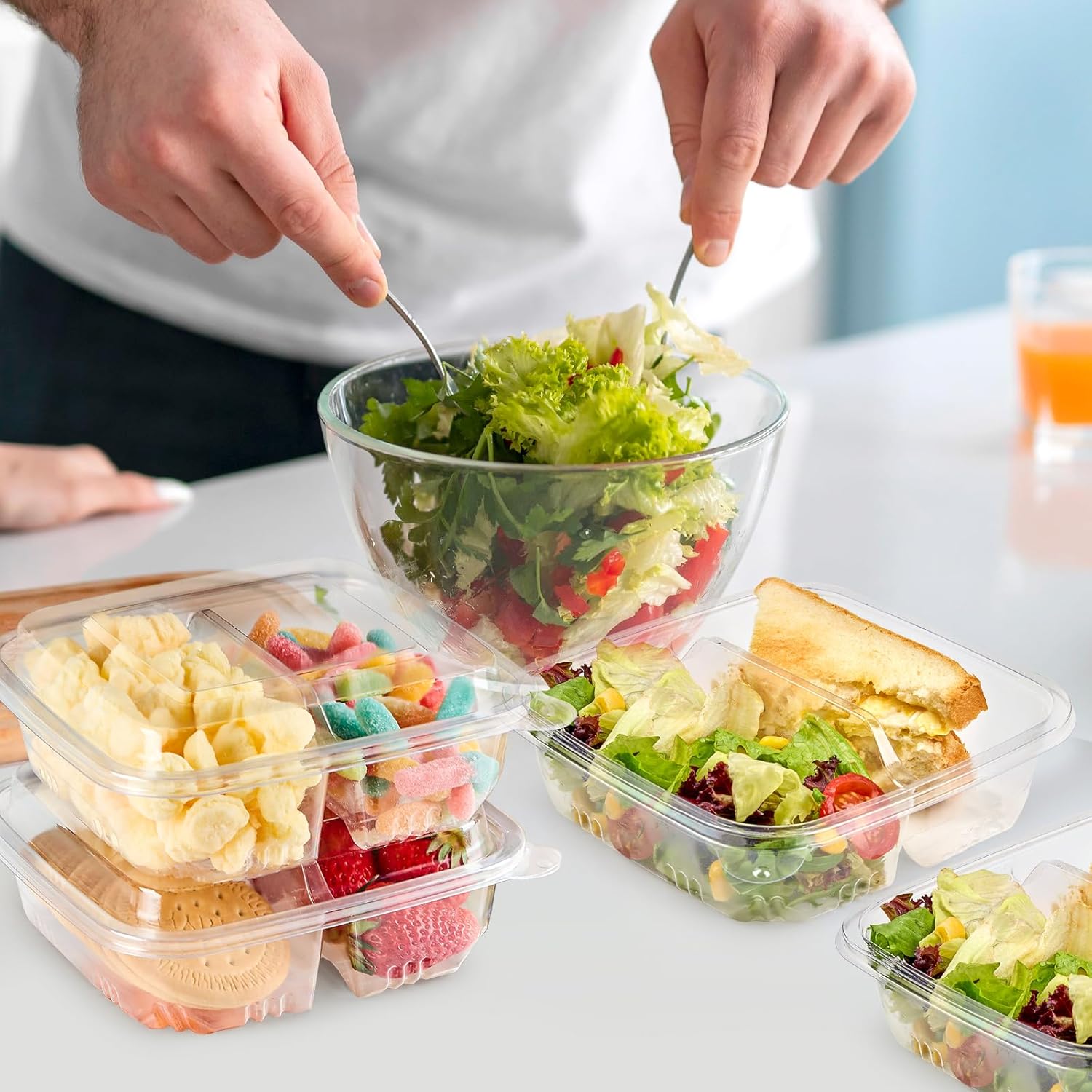 Bundle Contains: You’ll get 30 pcs bento snack containers with clear lids, and every container measures about 6.1”L x 6.1”W x 2.2”H, every compartment is about 2.4 x 6.1 inch