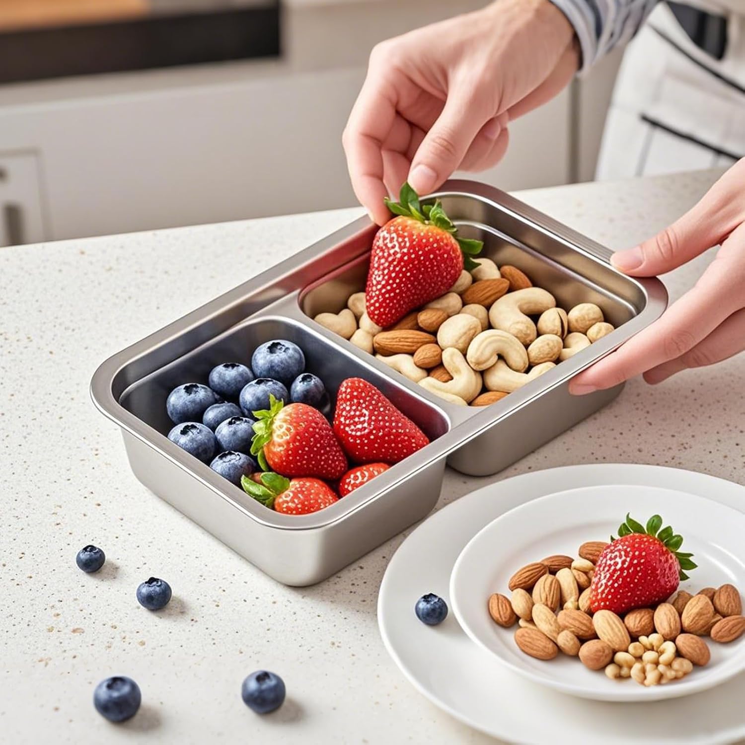 3Pcs Stainless Metal Snack Containers – Reusable Double Compartment Condiment Field with Lids for Youngsters Adults, Seize and Go Divided Snack Meals Lunch Storage Containers Sauce Cups for College, Journey