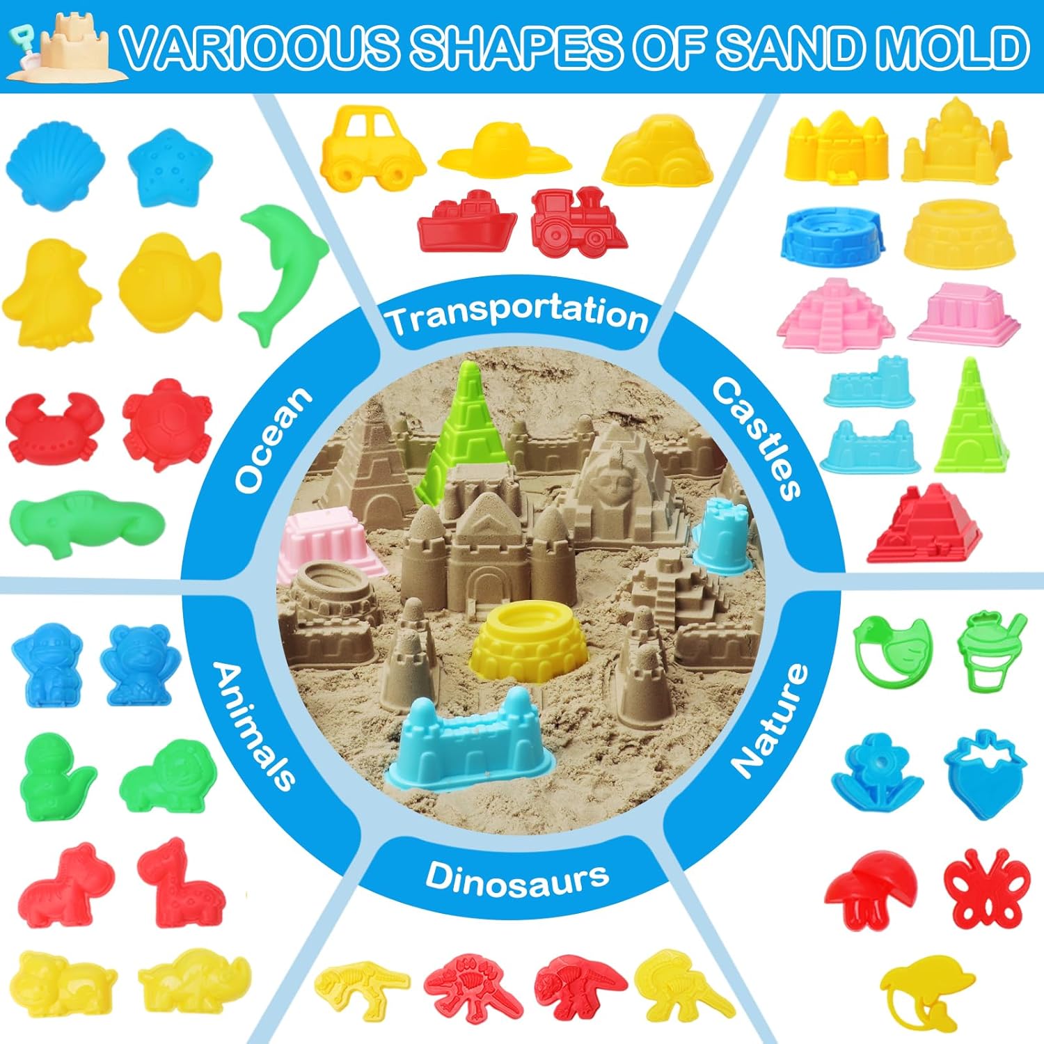 Seashore and Sandcastle Equipment: The set consists of 1 seaside bucket, 1 mesh scoop, 1 shell storage mesh bag, 1 double-shoulder storage bag,5-piece sand shovels, 42 sand molds in varied styles and sizes (The colour of the seaside mould is random), and three seaside toy automobile. This youngsters’s seaside toy set offers hours of enjoyable throughout the summer season.