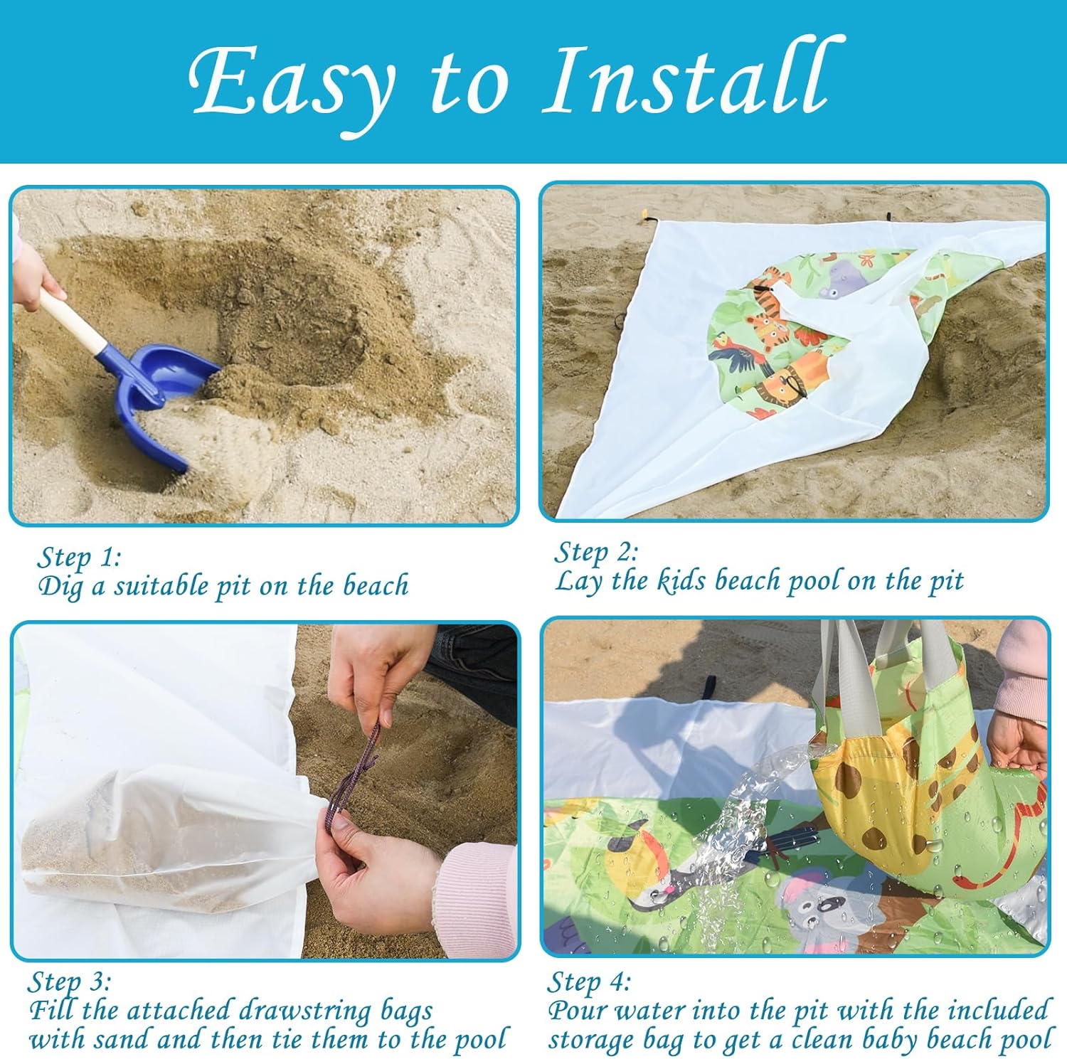 Straightforward to Use: No air pump required! It is simple to create a clear and spacious pool to your youngster by merely digging a good sized gap within the seaside, inserting the seaside pool on prime, and securing it by tying a drawstring bag crammed with sand to the pool! Let your kids play freely within the water with out hazard!