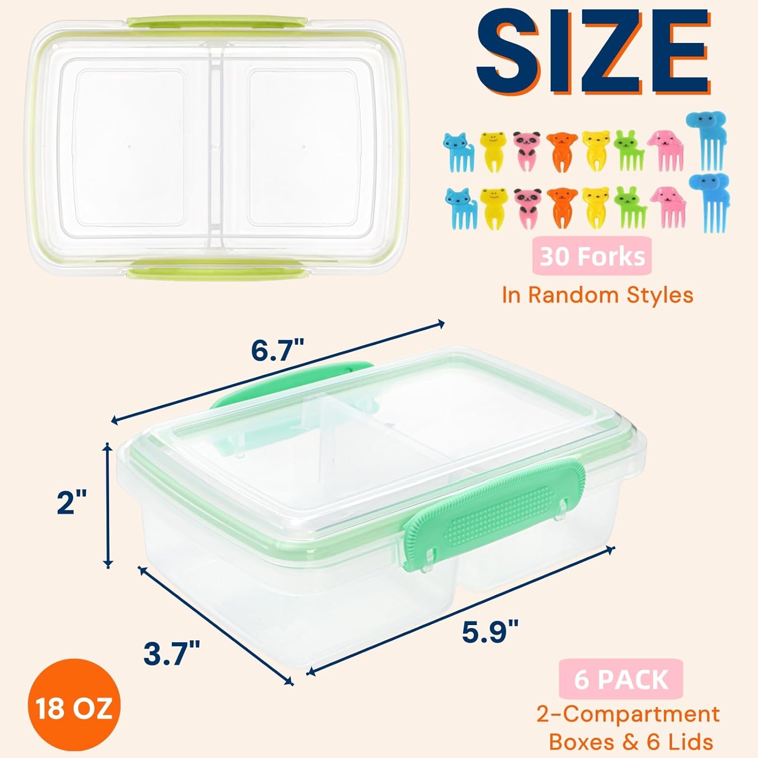 6 Pack Bento Snack Box with 30 Fork, 2 Compartment Snack Container with Lid, Reusable Lunchable Containers for Adults, Divided Meal Prep Food Storage Box for School, Travel, Dishwasher Safe