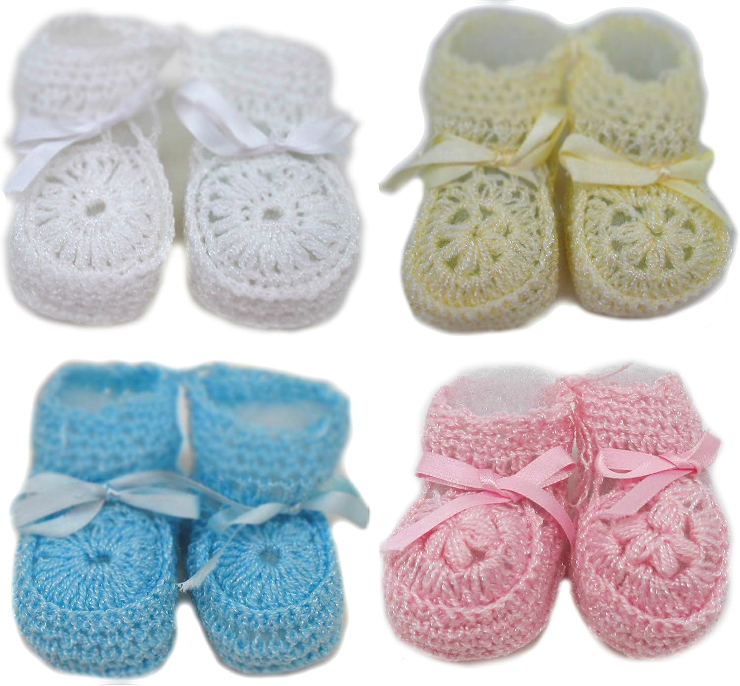 Handmade crochet booties with ribbon tie can be found in varriety of colours. These are comprised of 100% tender acrylic yarn.