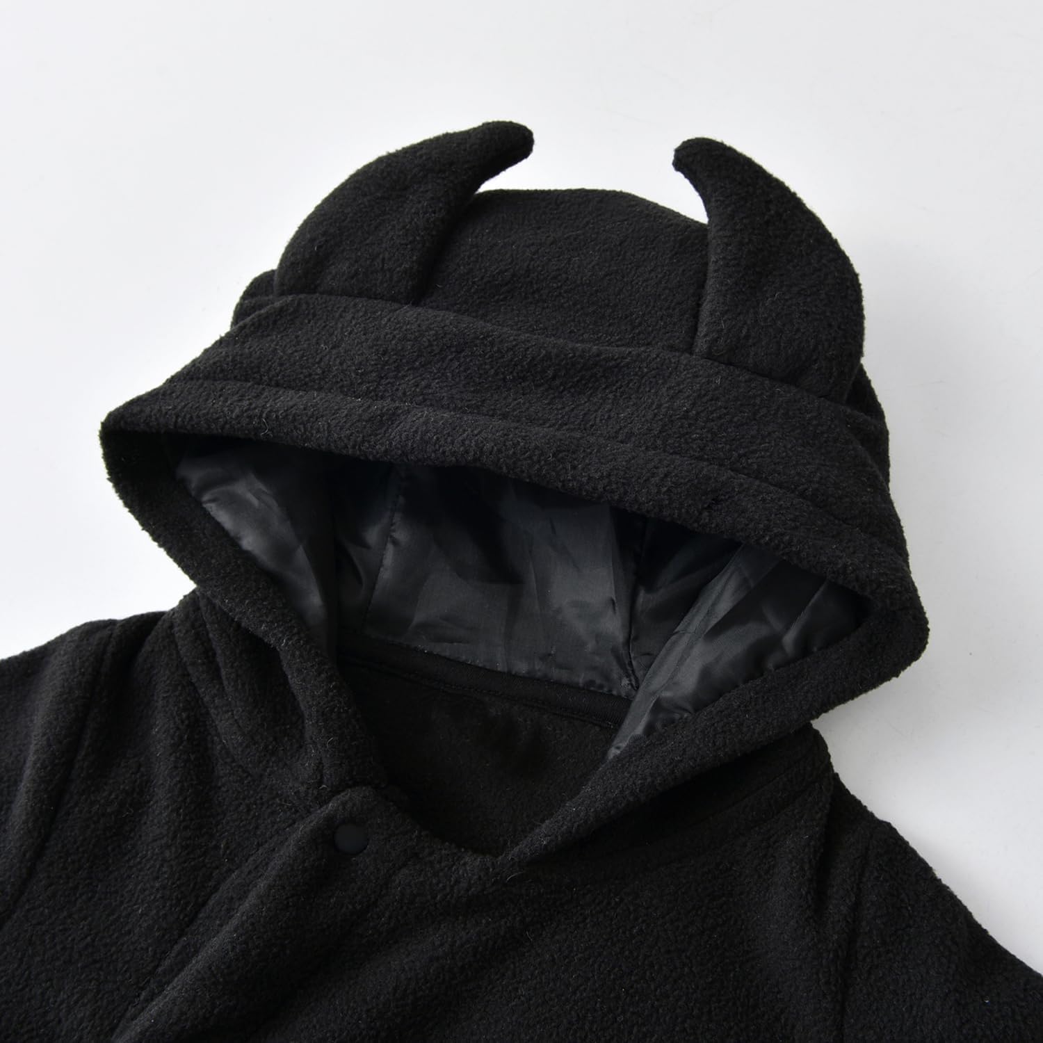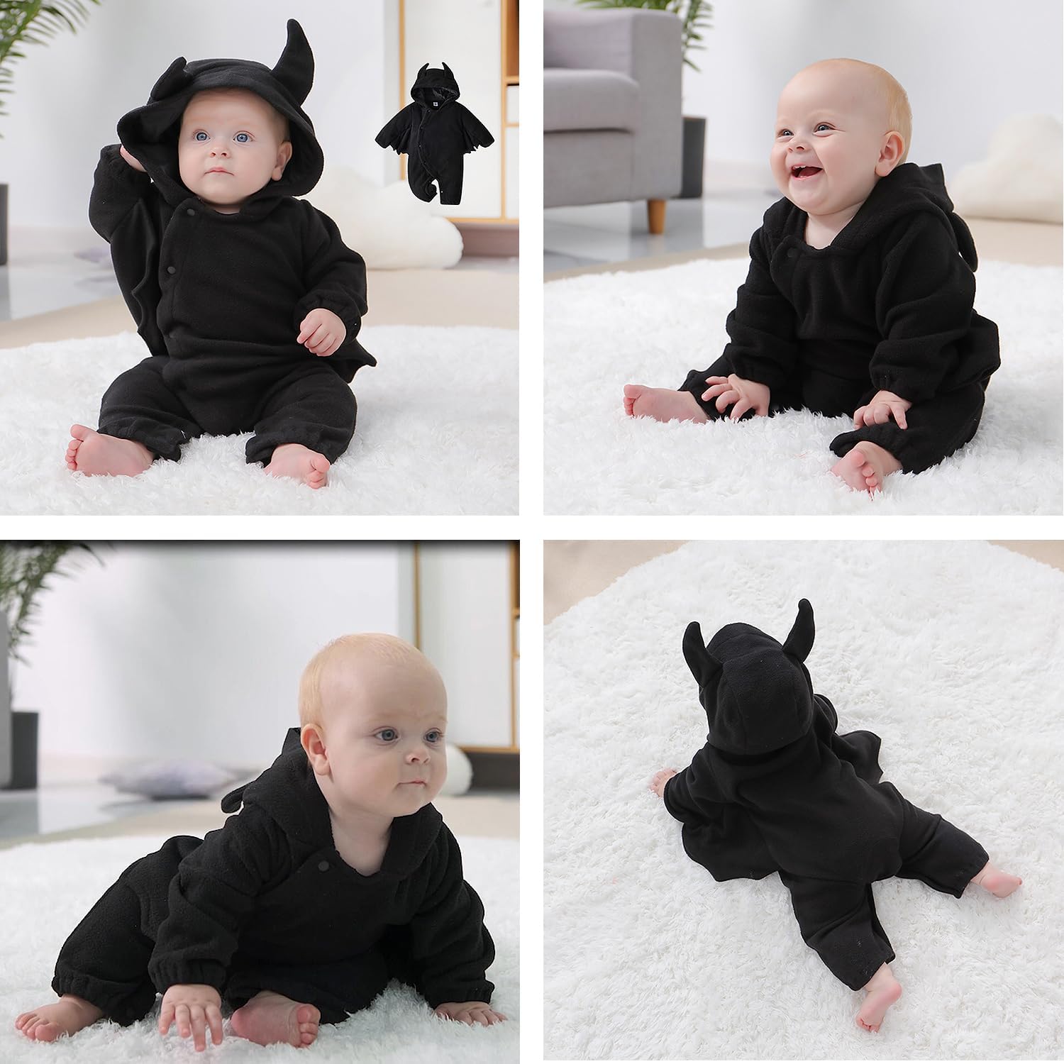 Design: black 3D bat ears hooded romper, lengthy cartoon black bat sleeve, pure black onesies romper, lengthy sleeve, button open.