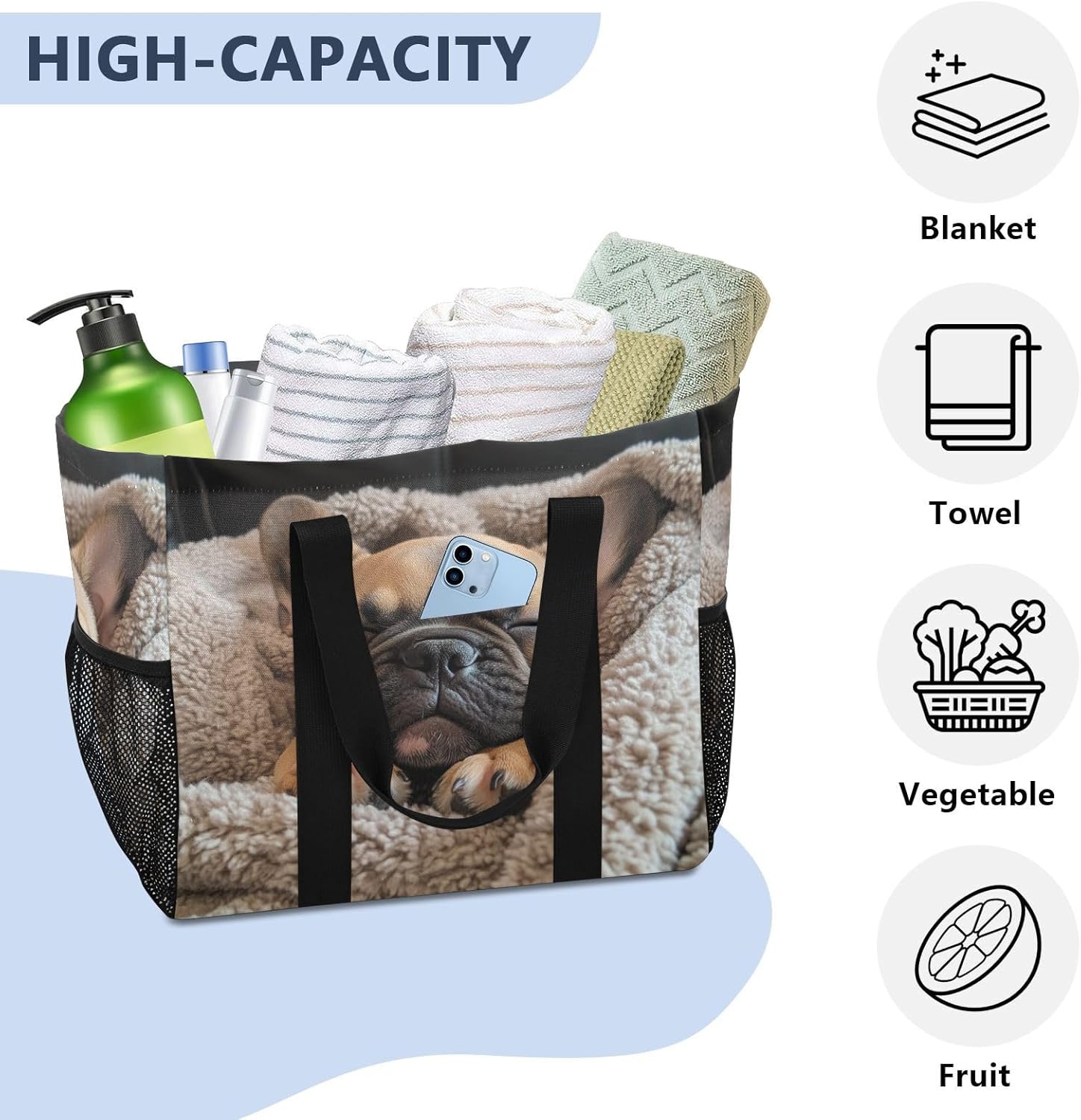 ALAZA Merry Christmas Cute French Bulldog Bone Christmas Hat Waterproof Beach Tote Bags