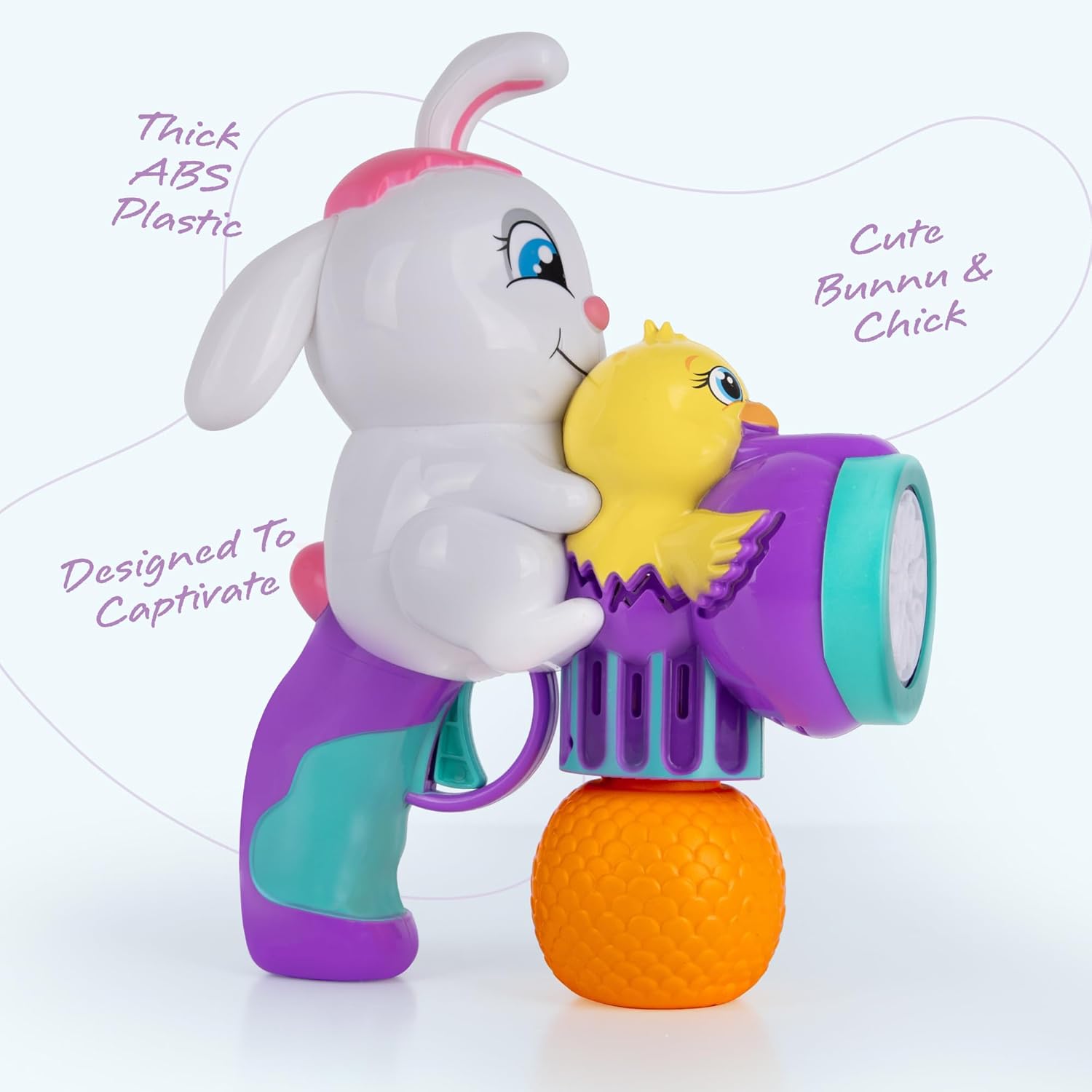 EXCLUSIVE AND CUSTOM DESIGN: Our bunny bubble blaster stands out with its distinctive design, that includes a cheerful bunny, a cute chick, and an egg-shaped holder. Not like unusual toys, it’s crafted for enjoyable and gifting delight.