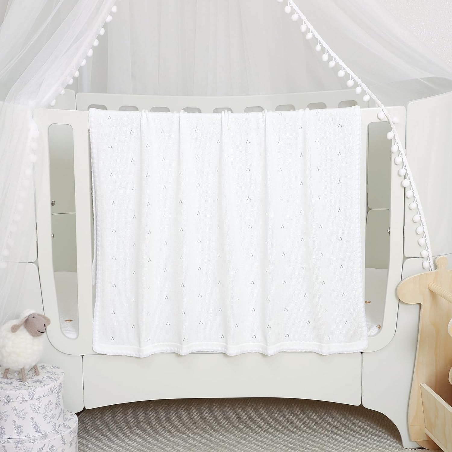 Timeless Design:The beautiful hemming craftsmanship of the Knitted blanket, concise and chic strong shade sample with its versatility, it seamlessly enhances any nursery room theme, presents accessible in a variety of unisex, gender impartial colours and trendy designs.