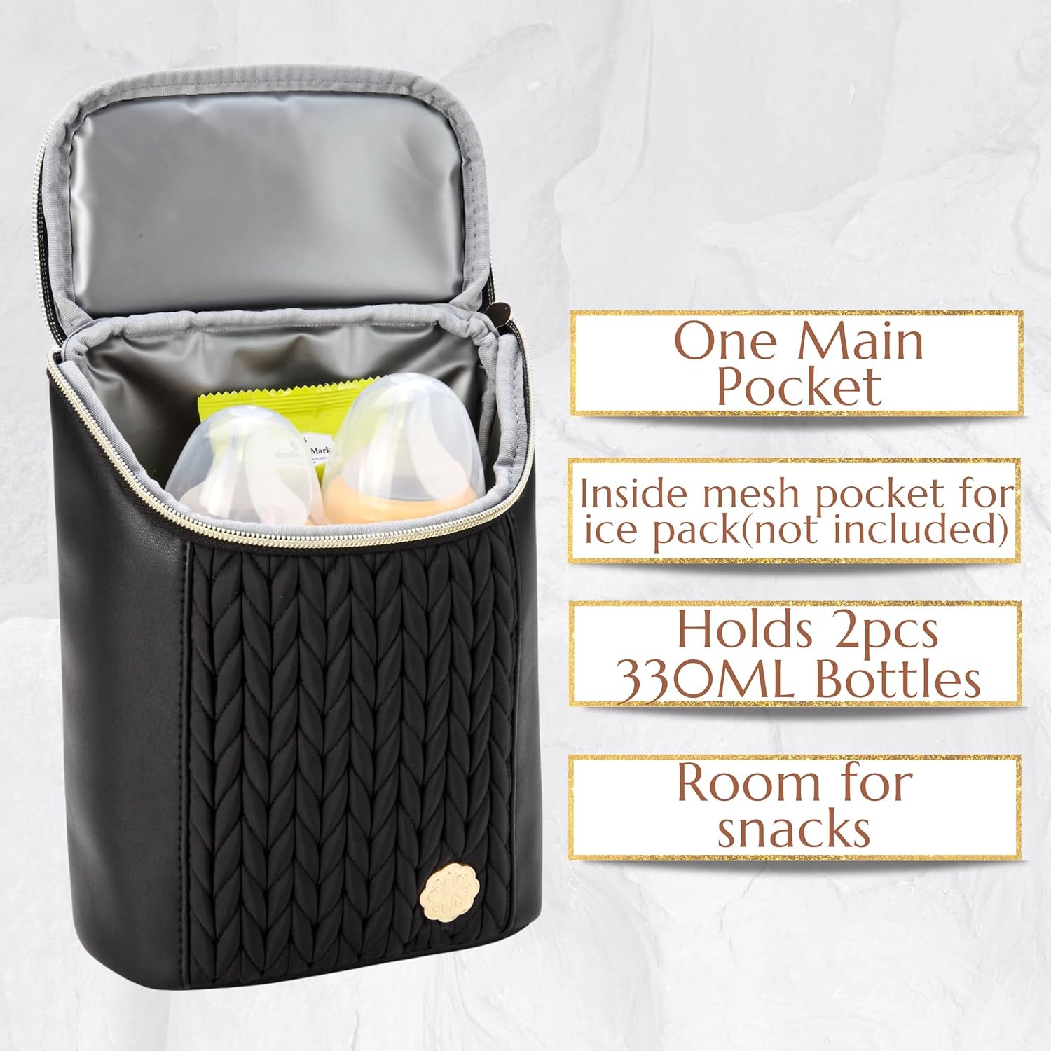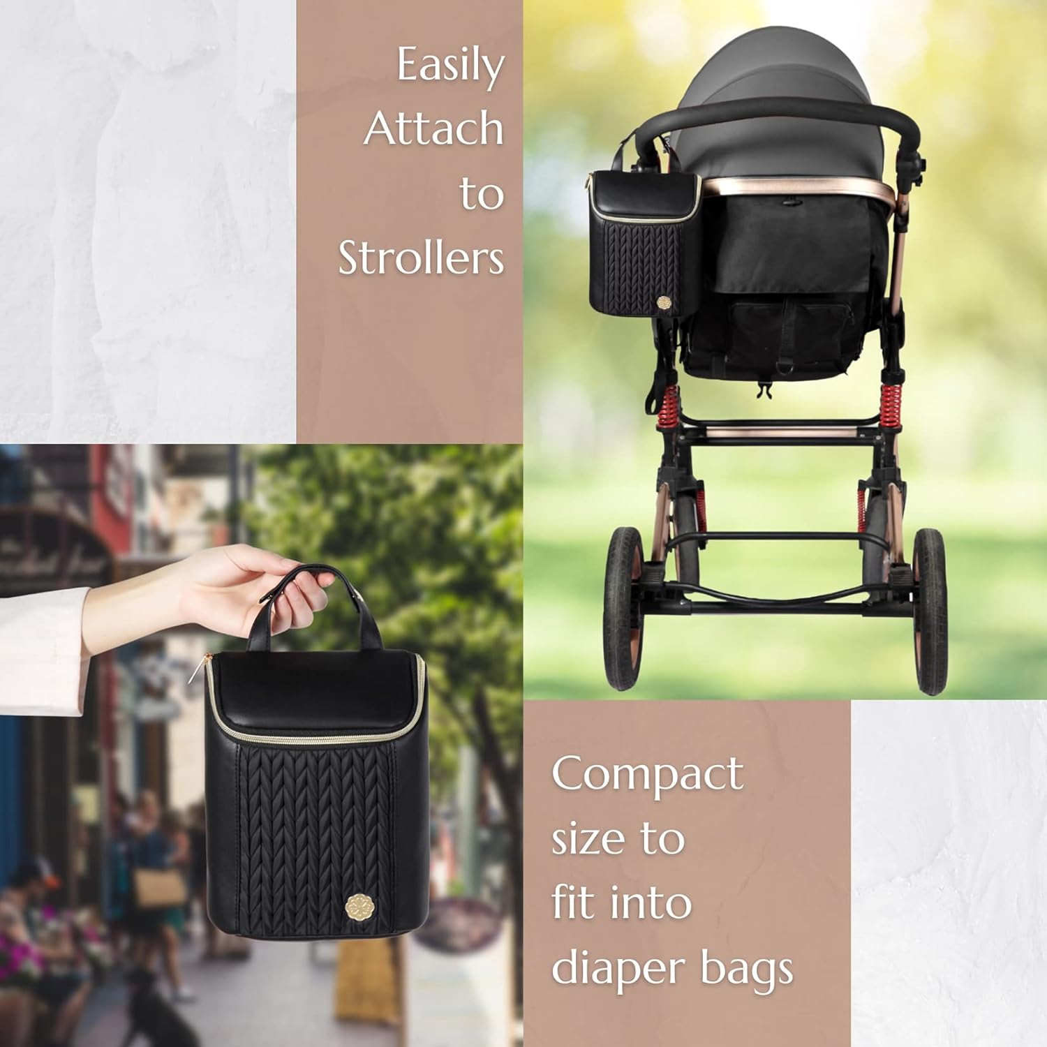 SMART DESIGN:The Insulated wipeable PEVA lining retains two or three bottles heat or chilly, that can keep the temperature fixed, maintain the milk or snacks cooler for as much as 4 hours, the inside mesh pocket with additional storage, the adjustable deal with could be simply connected to the stroller, Measures 6.75L x 3.5W x 9H (inch).