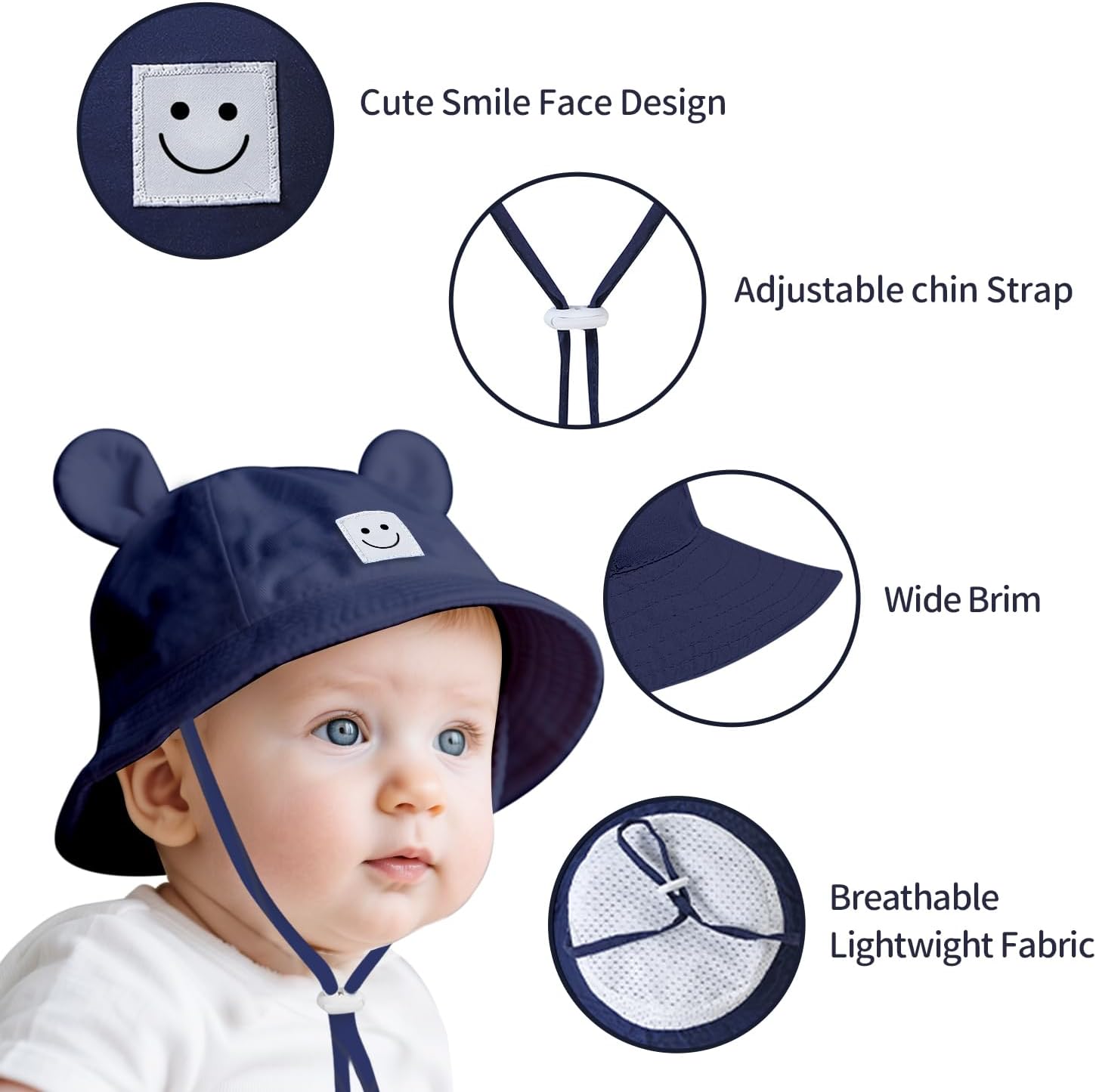 The infant bucket hat has a chin strap to maintain it keep on child head.