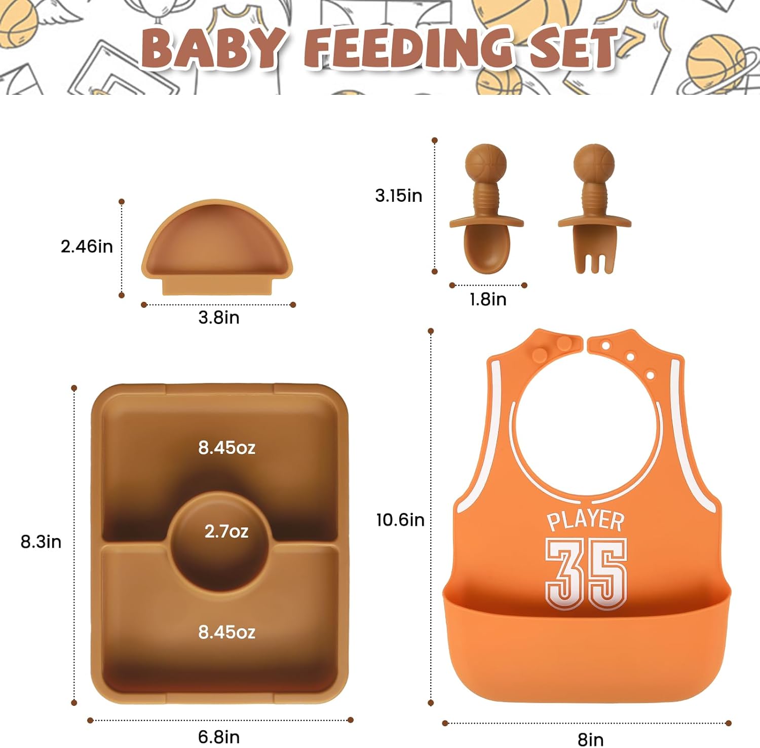 🏀Basketball Enjoyable Mealtime Set – Silicone Dish, Utensils & Bib for Youngsters 🏀