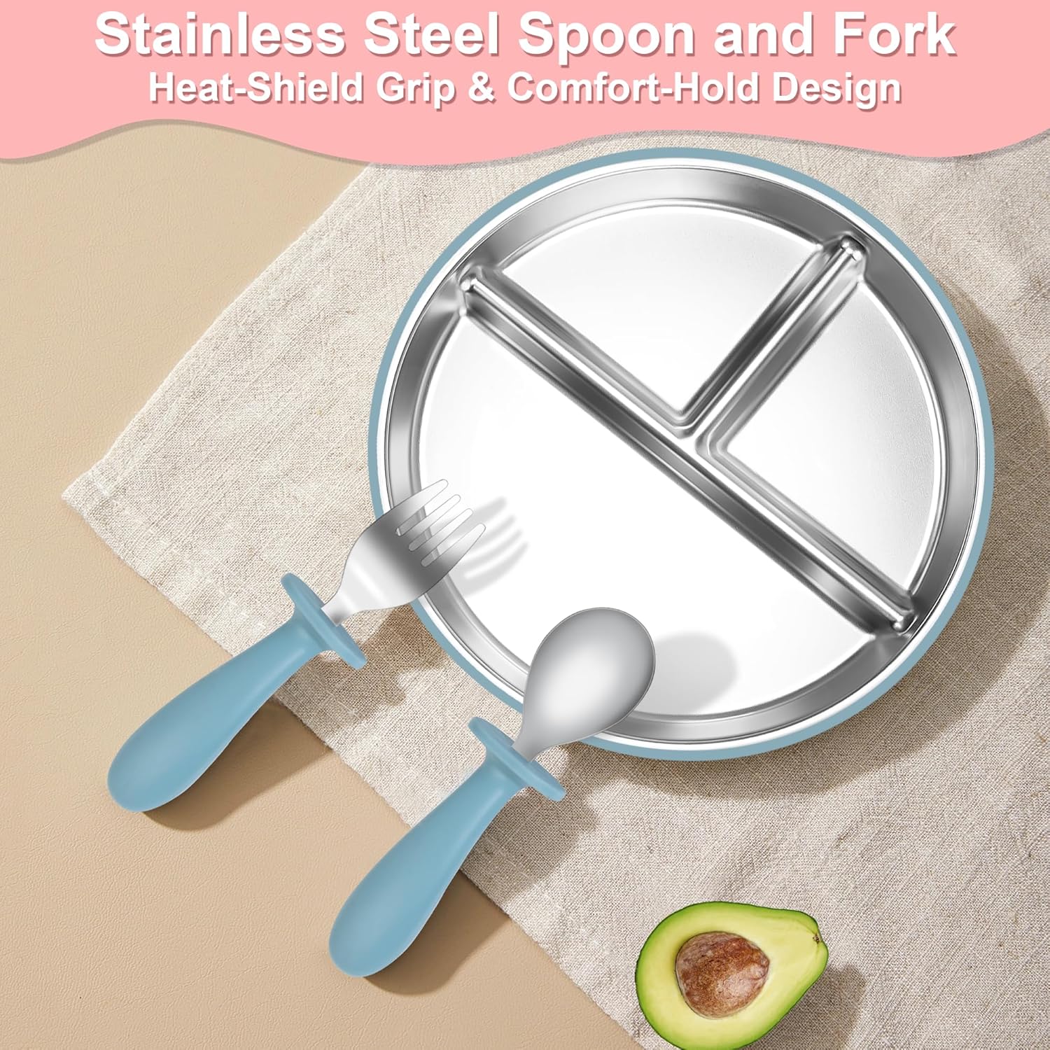 Toddler-Pleasant Tableware Set: Contains two 8″ divided plates, two spoons, and two forks, all crafted with rounded edges and easy-grip handles sized good for small fingers. Preferrred on your toddler studying to self-feed with confidence and independence