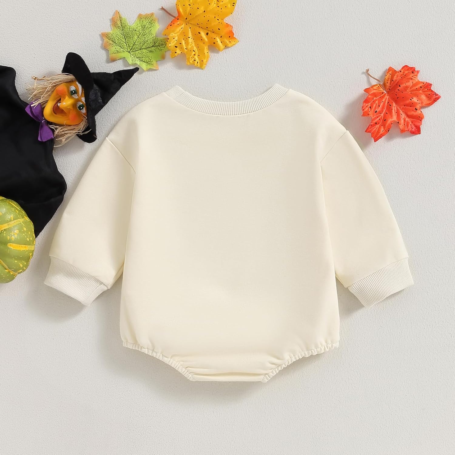 Child Halloween Sweatshirt Romper Pumpkin Bow Embroidery Lengthy Sleeve Spherical Neck Bubble Jumpsuit