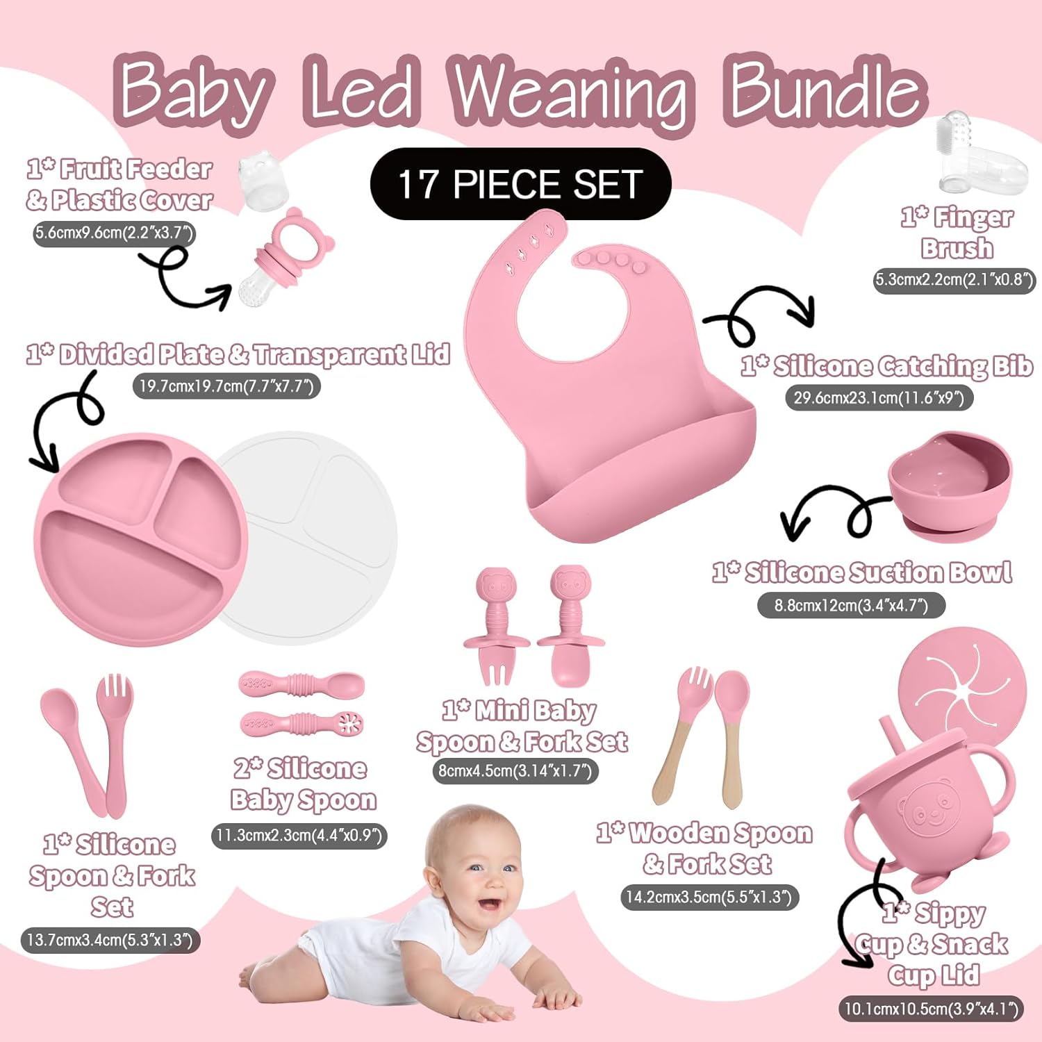 Child Led Weaning Provides: Get your child to like mealtime and unlock mum’s arms! The Child Weaning Set contains 1 Silicone Bib; 1 Divided Plate & Clear Lid; 1 Silicone Suction Cup; 1 Sippy Cup & Snack Cup Lid; 1 Fruit Feeder & Plastic Lid; 2 Silicone Child Spoons; 1 Mini Child Spoon & Fork Set; 1 Picket Spoon & Fork; 1 Silicone Spoon & Fork Set; 1 Finger Brush.