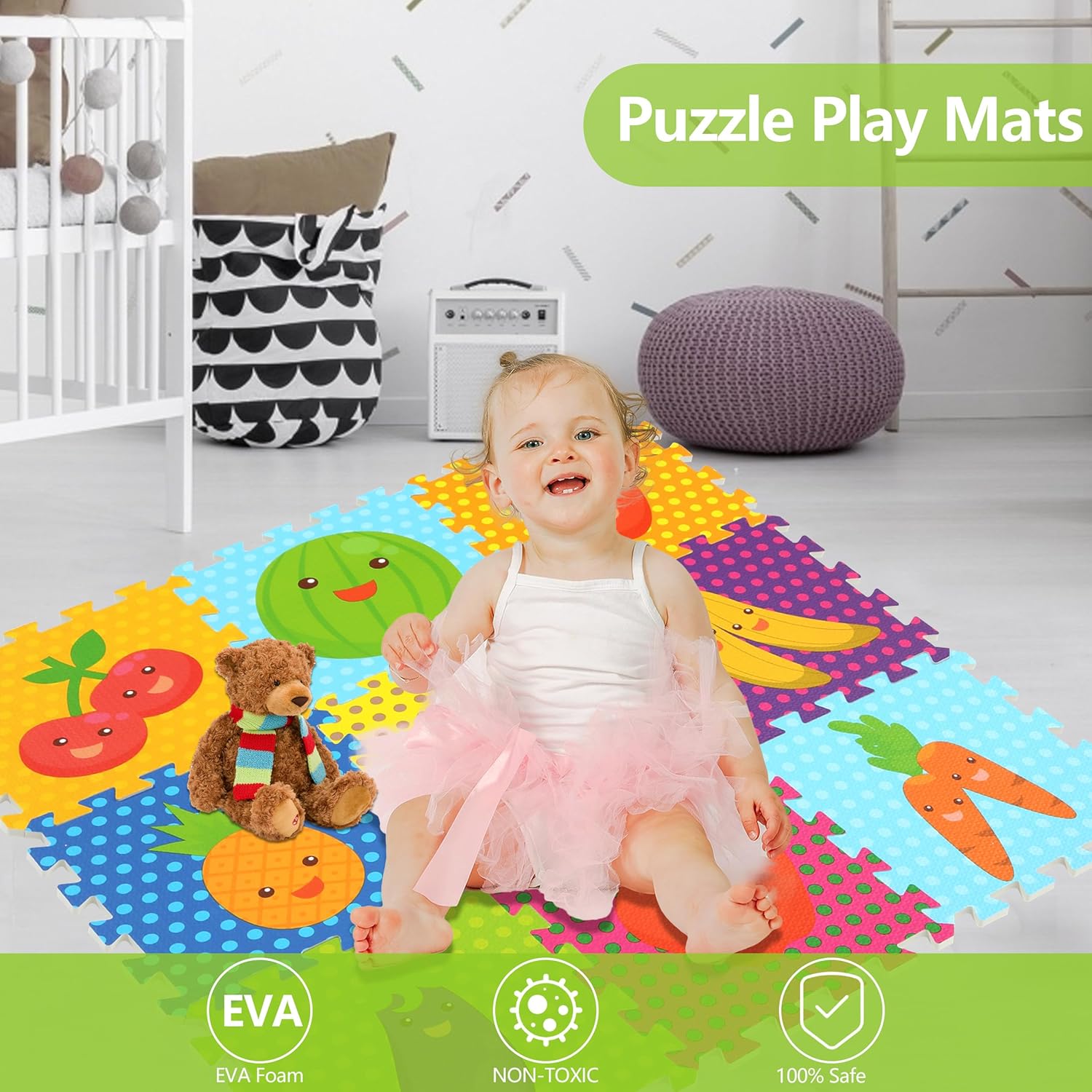 Enjoyable and Participating Interlocking Foam Mats-This kids’s play mat has 9 items about Sea World,Fruits,Automobile,Animal.You may select the fashion that most accurately fits you. The dimensions when tiled is 34×34 inch.The size and width of every foam is 11.8×11.8 inch and 0.39 inch thick.This child play mat is a flexible alternative for making a enjoyable and secure play space on your little angel.