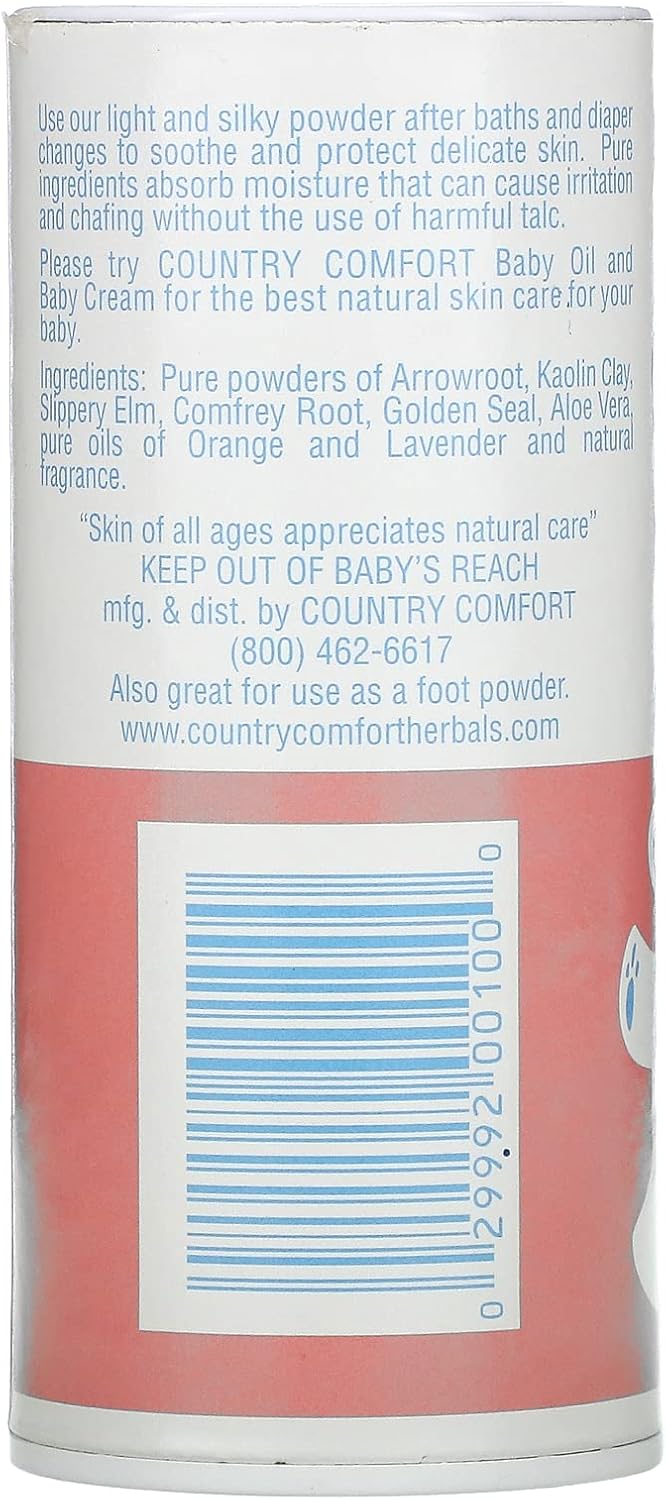 Use our gentle and silky powder after baths and diaper adjustments to assuage and defend delicate pores and skin. Pure substances take up moisture that may trigger irritation and chafing with out using dangerous talc. Please attempt Nation Consolation Child Oil and Child Cream for the perfect pure skincare on your child. Additionally nice to be used as a foot powder.