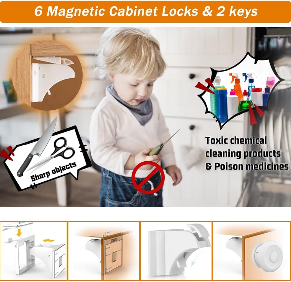 Baitiny’s Child Proof Equipment affords a complete answer for youngster security, together with 6 magnetic cupboard locks with 6 bars and a pair of keys +6 child security strip locks + 5 giant clear nook guards + 5 “L” clear nook guards + 14 outlet plugs and key.