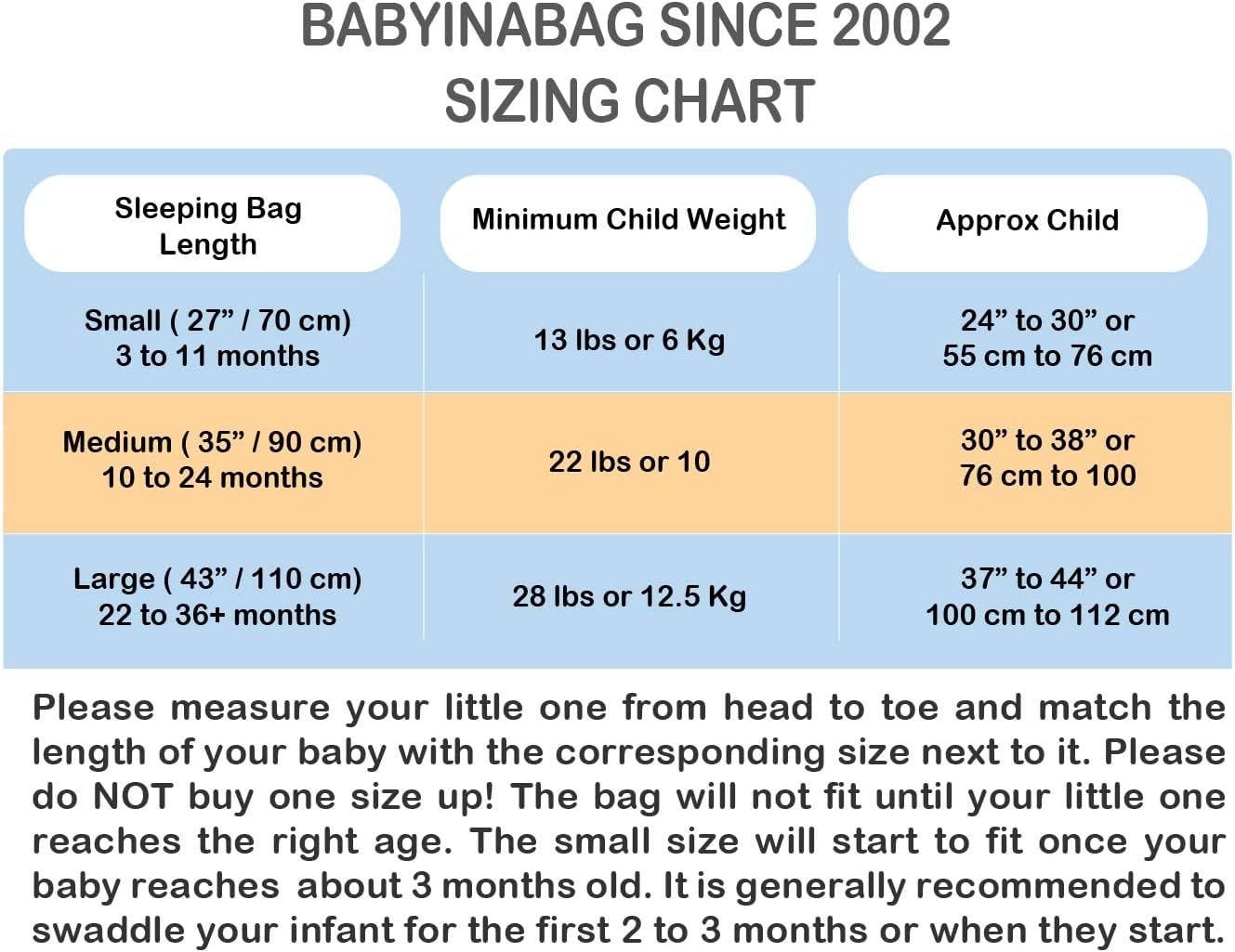 SIZING: Please measure your toddler from head to toe and match the size of your child with the corresponding measurement subsequent to it on our sizing chart. Please do NOT purchase one measurement up! The bag won’t match till your toddler reaches no less than 2 to three months for the small measurement, 30” for the medium measurement and 37” for the big measurement. It’s usually advisable to swaddle your toddler for the primary 2 to three months or after they begin to roll. Select a sleeping bag that’s appropriate for the season.