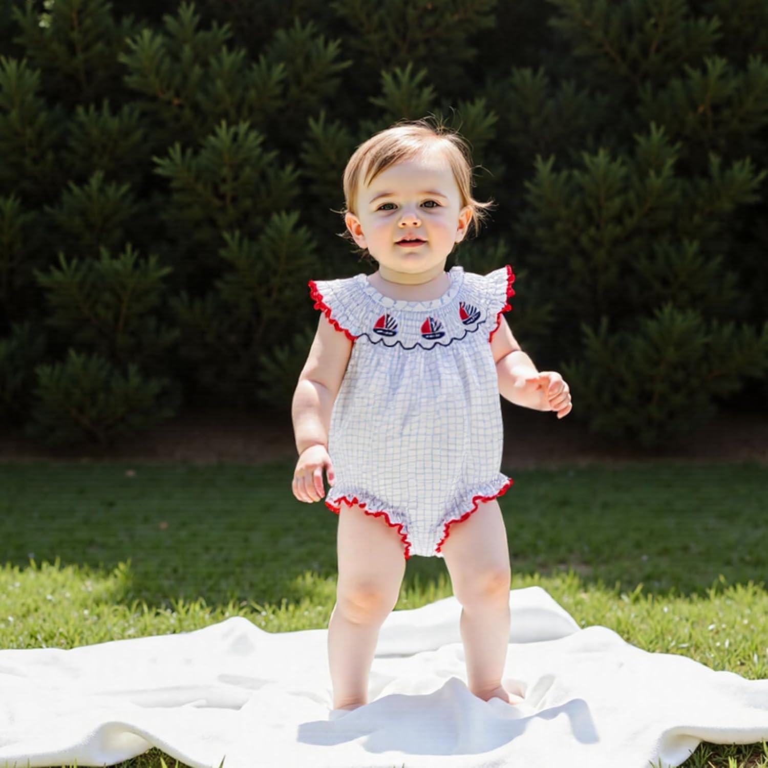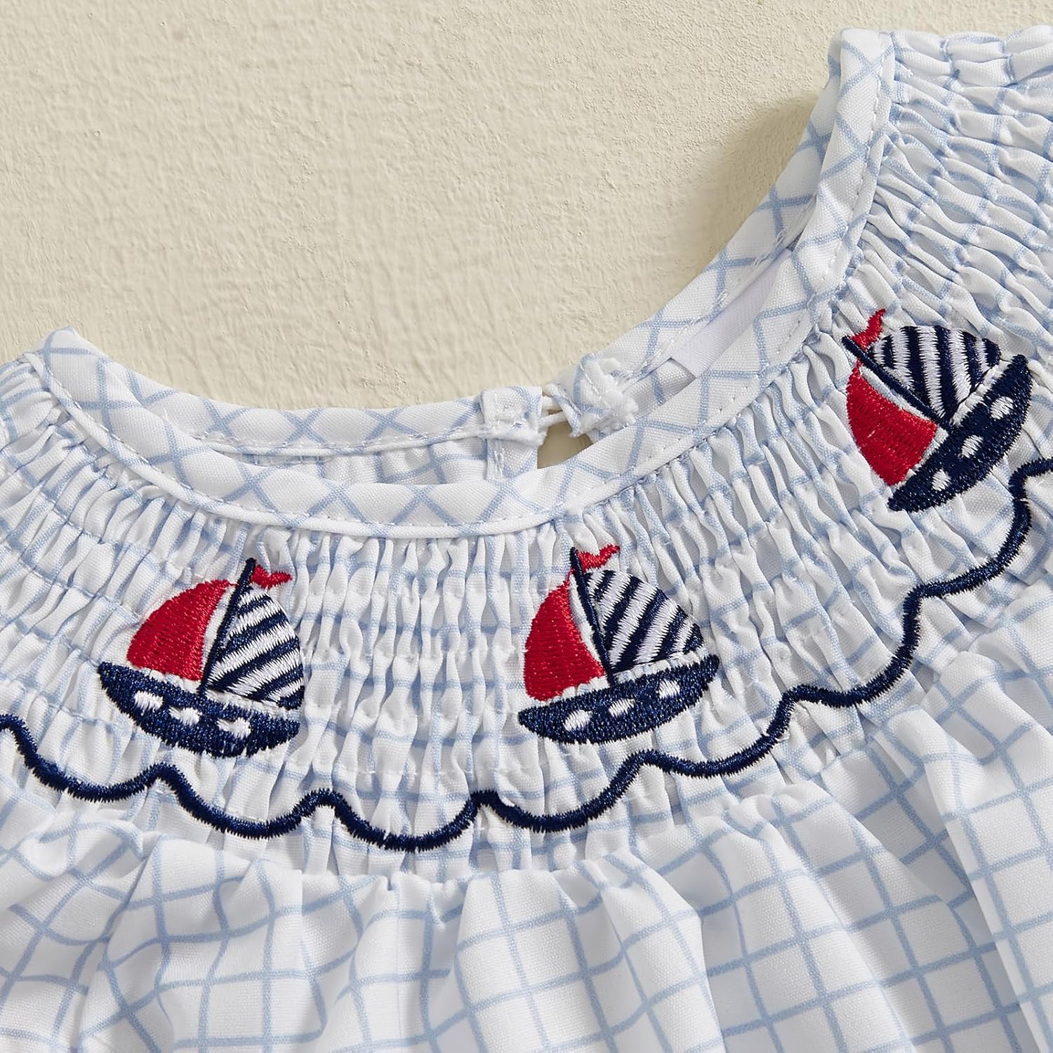 Bagilaanoe Summer Clothes Baby Girl Outfit Sailboat Embroidery Plaid Short Sleeve Romper Smocked Bubble Romper Bodysuit