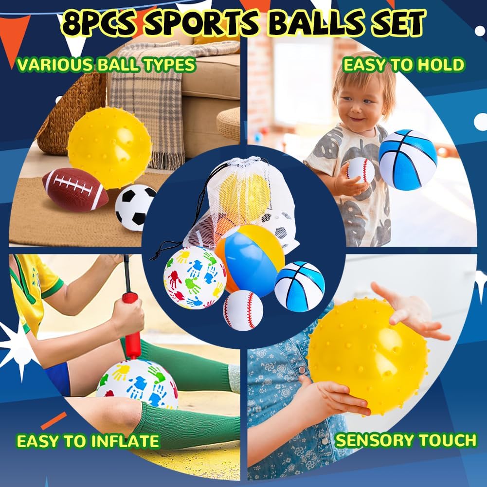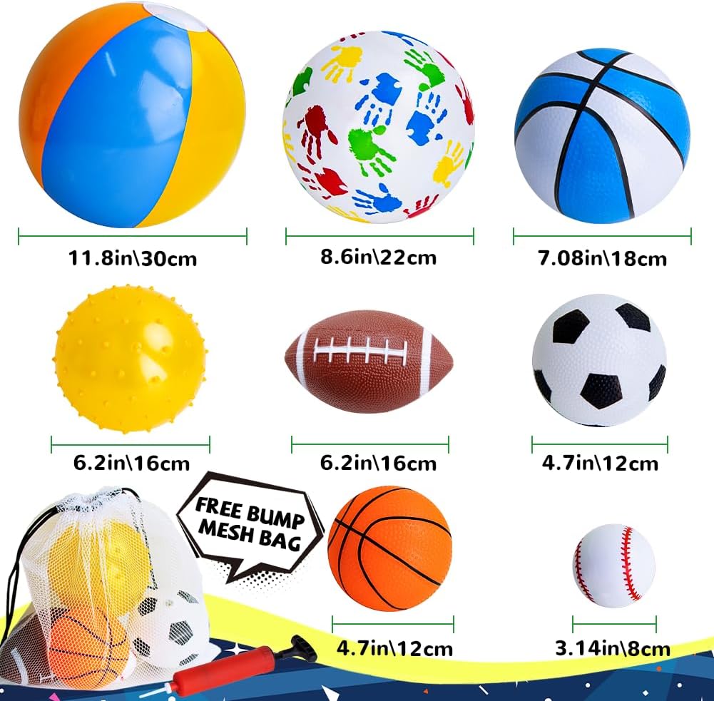 【SET OF 8 UPGRADED VALUE KIDS BALL SET】The wealthy and attention-grabbing toddler sports activities ball set is designed for girls and boys aged 1-3 to play and benefit from the enjoyable of sports activities. Contains 2 basketballs (4.8/7 inches), 1 soccer (4.7 inches), 1 baseball (3.1 inches), 1 rugby (6.2 inches), 1 bouncy ball (6.2 inches), 1 palm sample ball (8.6 inches) and a seashore ball (11.8 inches) in addition to a free air pump and mesh bag. These great ball toys make playtime extra pleasing.