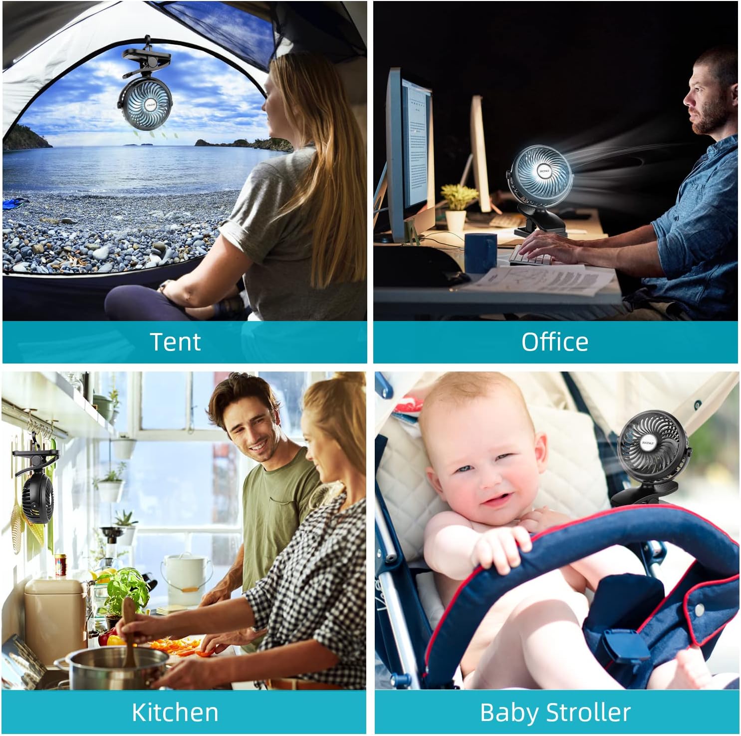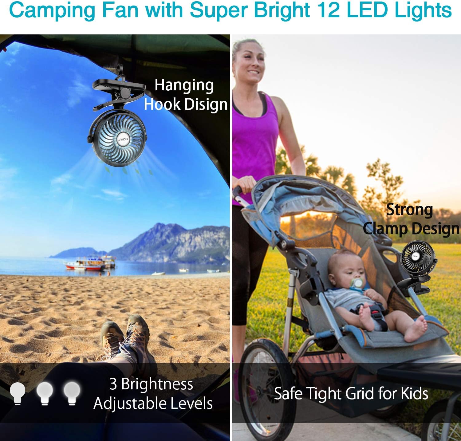 Moveable Tenting Fan & Clip on Design- Excellent selection whenever you go tenting, for child stroller. Moveable and useful, cling hook design, simply hanging in a tent, RV or outdoors branches. Designed with tremendous brilliant 12 LED lights, lights up your tent or campsite in darkness