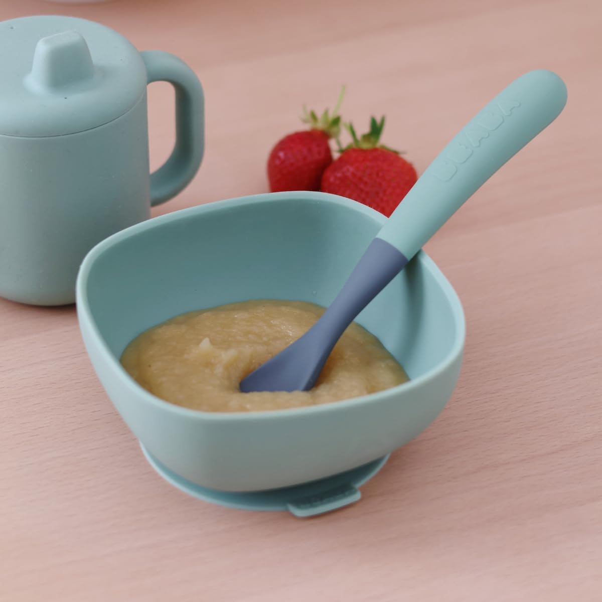 First stage silicone child spoons set for infants 4mo+. The comfortable silicone materials: to keep away from irritating infants’gums.