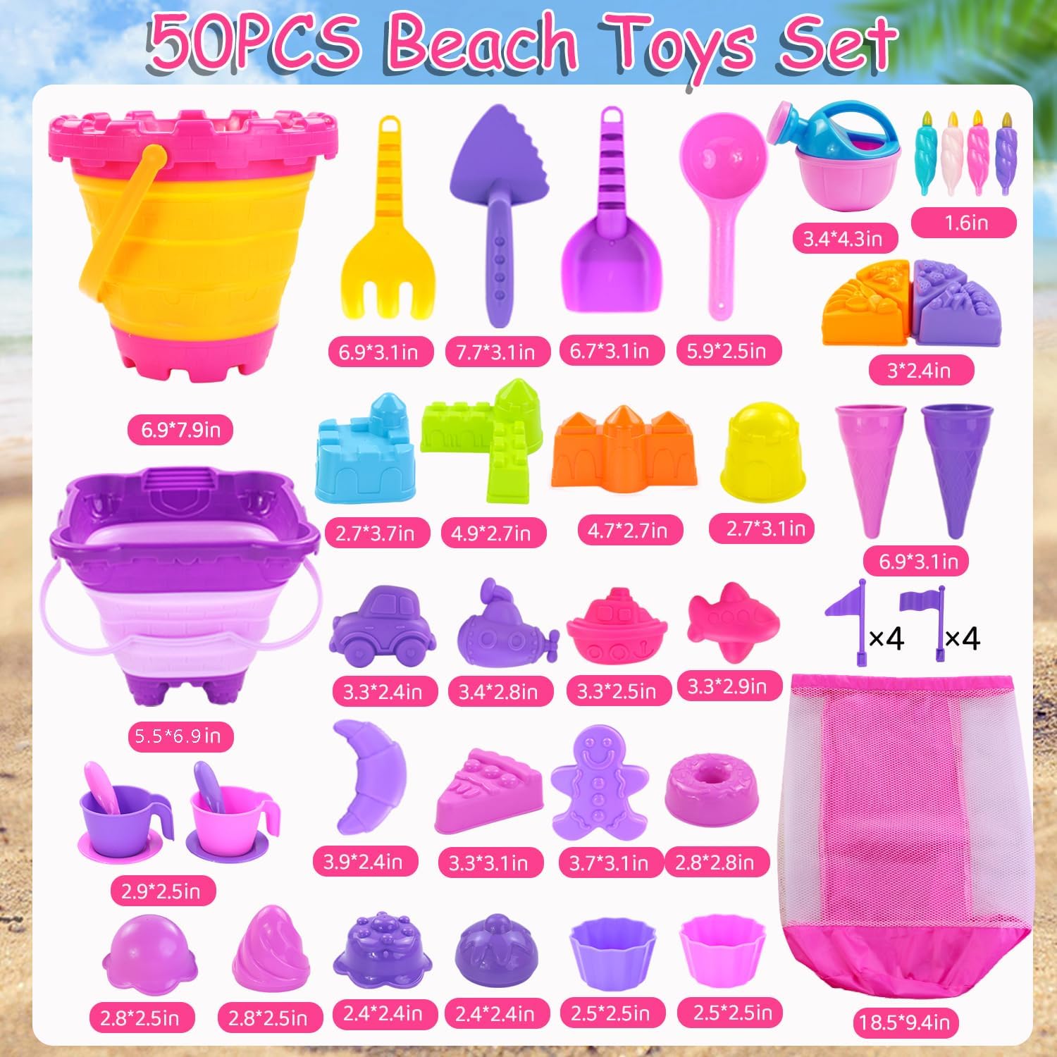 50PCS RICH BEACH ESSENTIALS: Unleash creativity and enhance hands-on abilities with our sandbox toys, which comes with the whole lot you want for outside seaside enjoyable.Included sand pails, fortress/ice cream/cake/car sand molds, teacups, watering can, shovels,rakes, sieves, and a pink mesh bag and so on