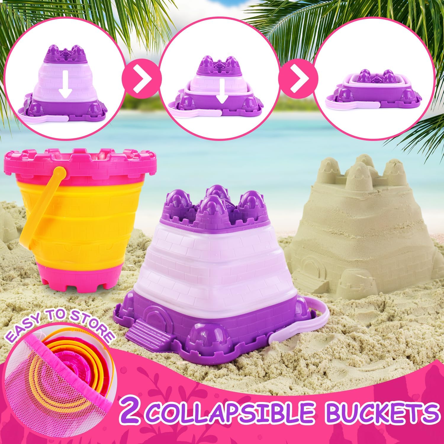 COLLAPSIBLE BEACH SAND BUCKETS: Our children seaside toys set comes with two completely different sizes of foldable silicone buckets (2.7L and 1.6L) for sand, water, shells or something. The pails could be opened and folded with only a gentle press – good for household seaside journey. The distinctive bucket shapes are perfect for creating sand castles or muffins