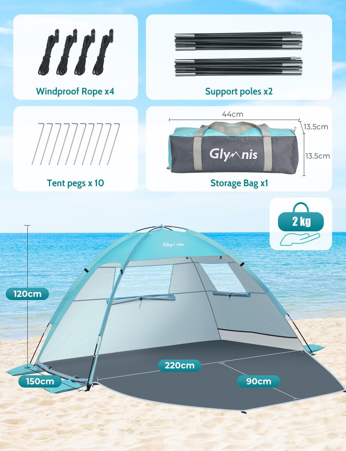 Light-weight and Moveable: The Glymnis seaside shelter has a small storage quantity, solely 44×13.5×13.5 cm, and weighs 2 kg. It may be effortlessly packed right into a backpack, suitcase or automotive trunk, saving area. With its helpful carry bag, you’ll be able to simply take it with you. It’s your supreme companion for leisure and trip