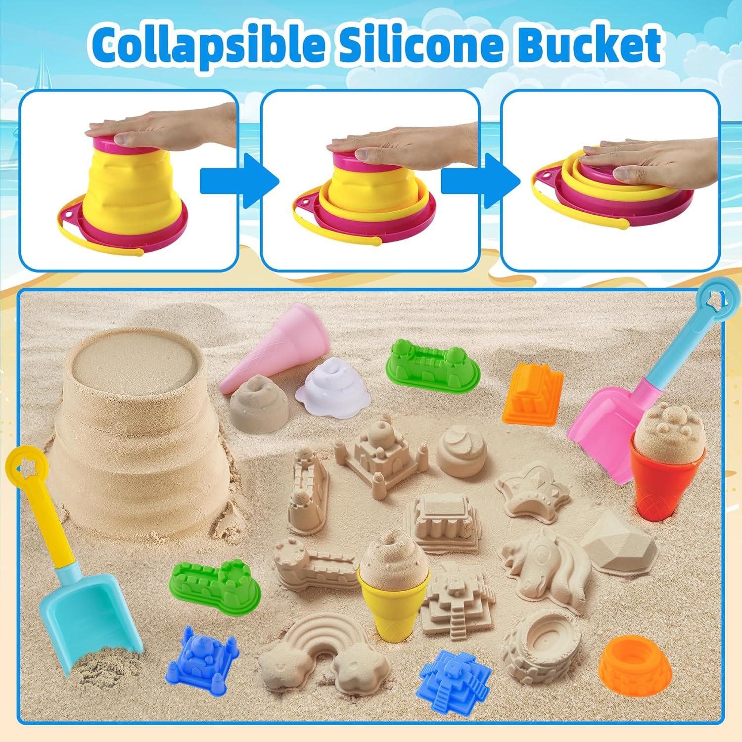 Foldable Seashore Toy Set: Contains 3 spherical silicone folding buckets in numerous colours, 4 shovels in numerous shapes, 6 fortress molds, 4 sand molds (pony, crown, rainbow, diamond), 8 ice cream molds, 1 ice cream scoop and three seaside web luggage