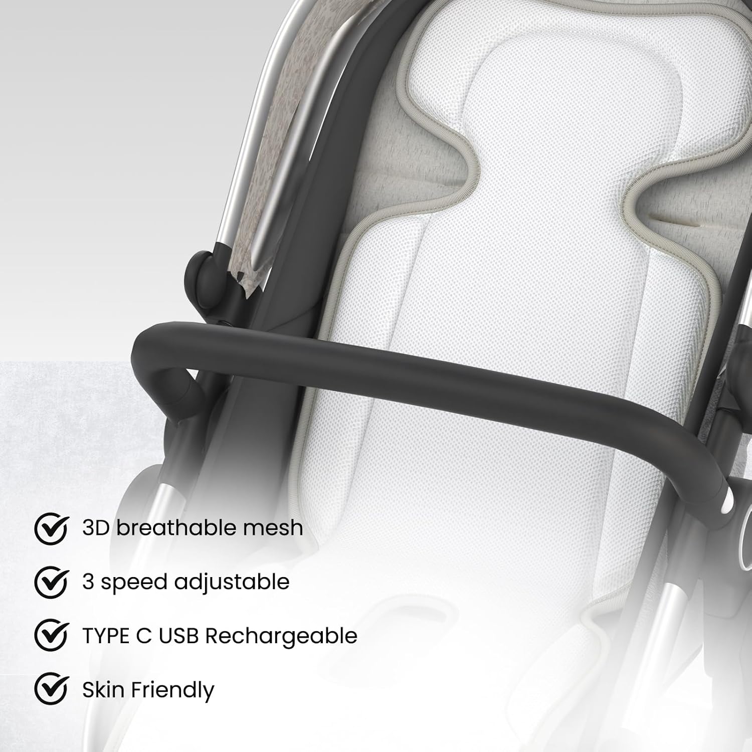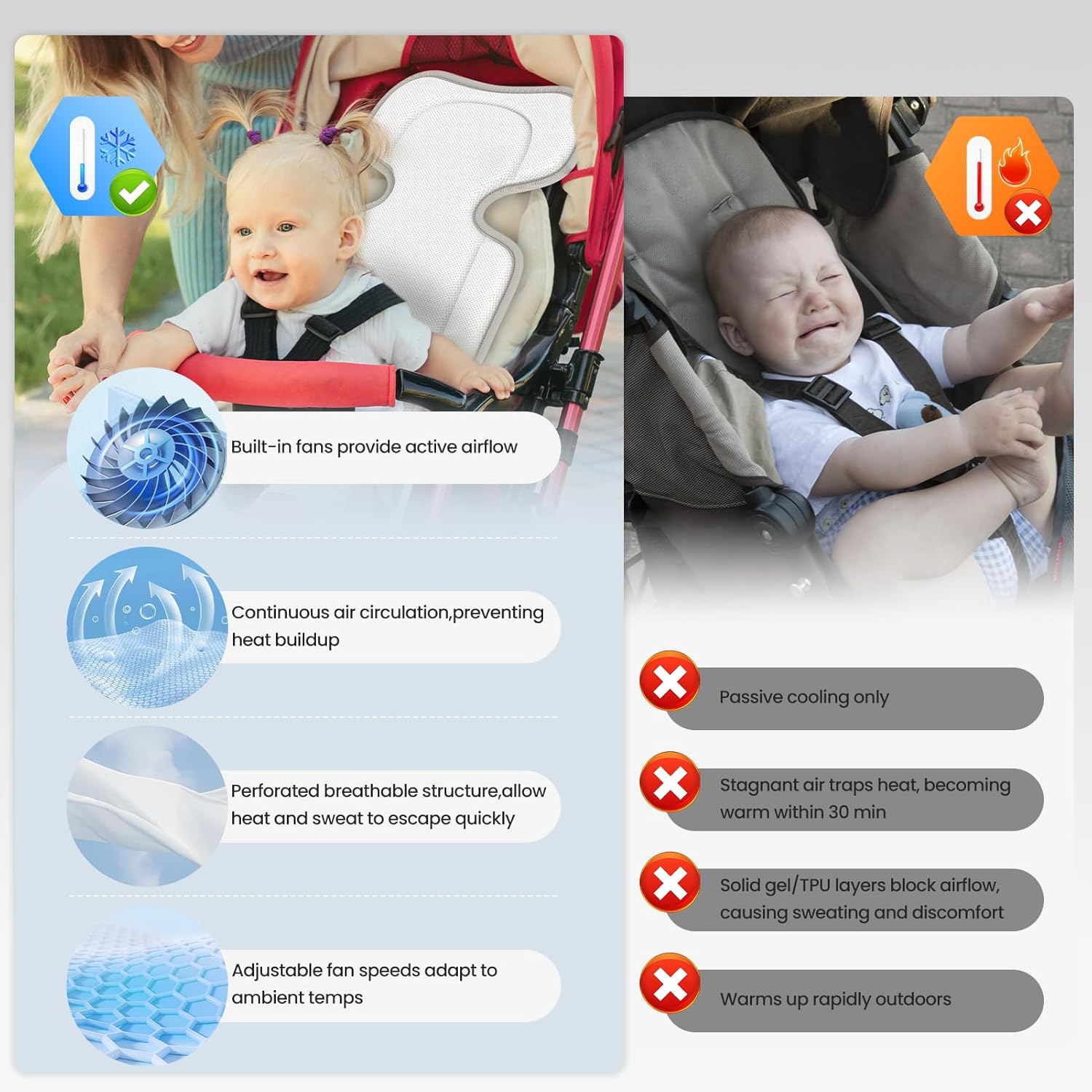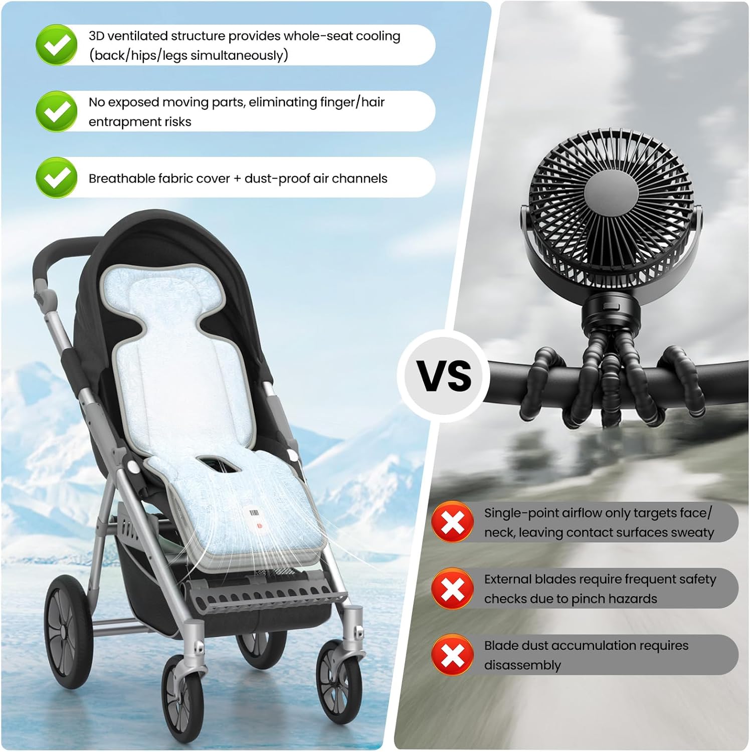 【1+1>2 cooling impact】Our 3D ventilated construction delivers whole-seat cooling (again/hips/legs concurrently), whereas conventional stroller followers solely present single-point airflow (face/neck), leaving contact surfaces sweaty. Whereas every resolution works independently, their mixture creates a breakthrough 1+1>2 cooling impact by working in tandem to take care of 360° all-around cooling.