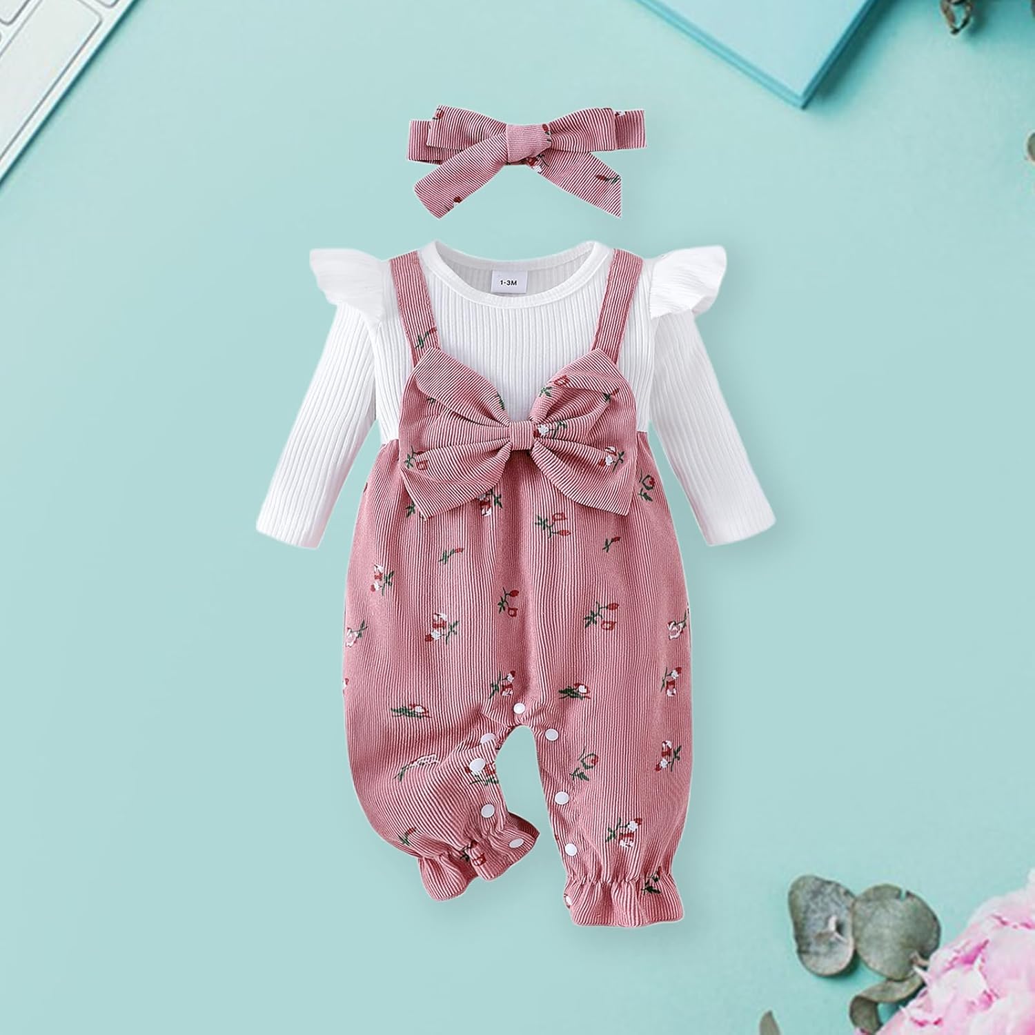 BeQeuewll Fall Winter Baby Girl Clothes Newborn Romper Floral Print Fake Two Pieces Bow Jumpsuit Baby Coming Home Outfit