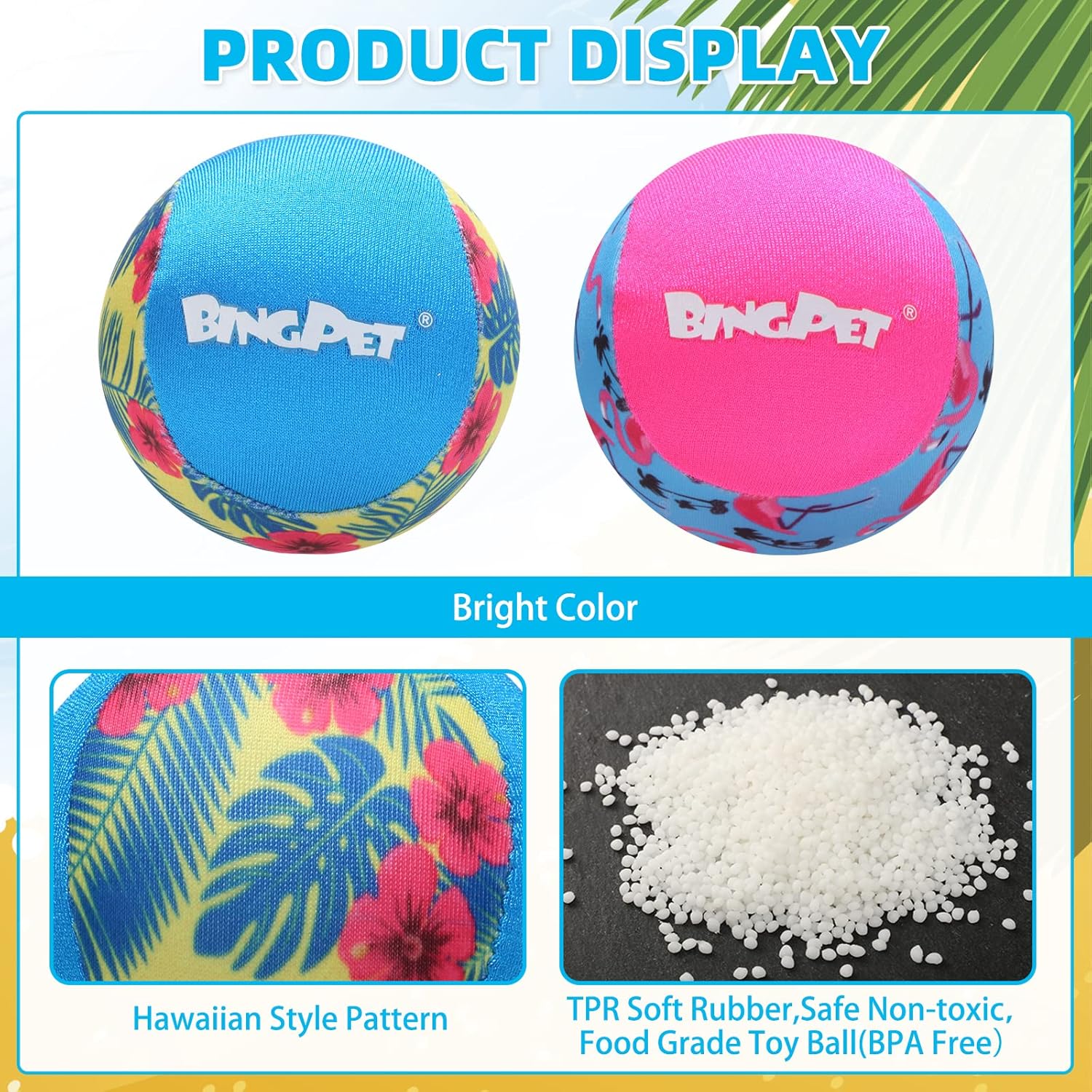 BINGPET Interactive Canine Bouncy Ball Measurement: 2.36 inches (6 cm) in diameter Materials: TRP smooth glue Look Design: Hawaiian fashion motifs, flamingos, leaves Breed: All Breed Sizes