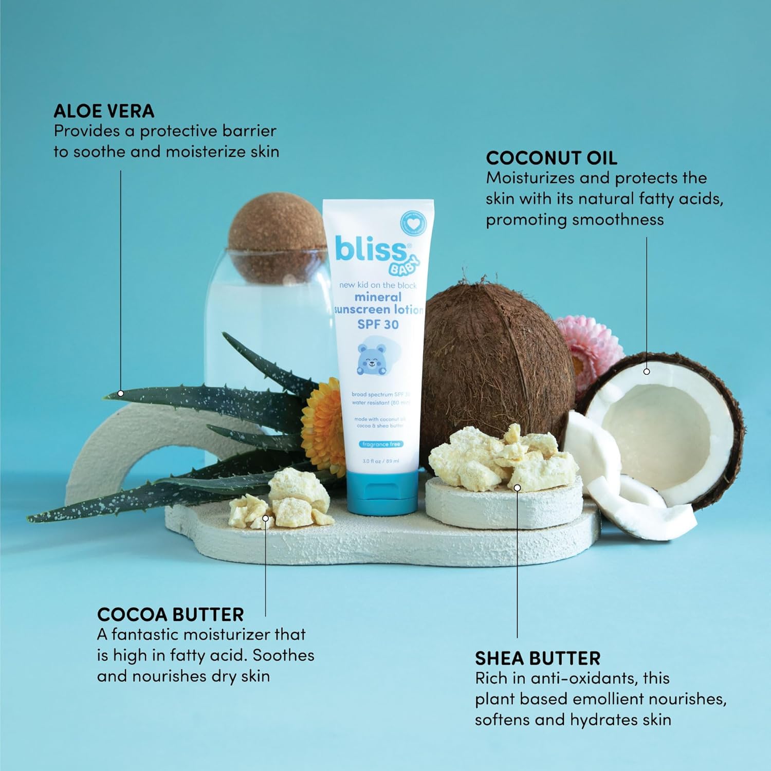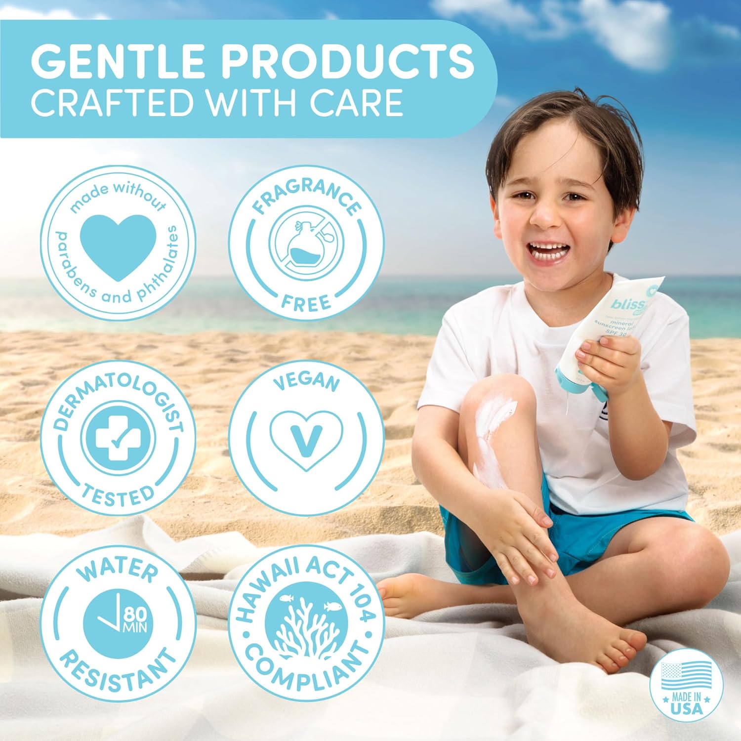BLISSFUL PROTECTION: Bliss child mineral sunscreen supplies mild, secure & pure SPF 30 solar safety. Face & physique safety for infants, children & adults with delicate pores and skin. Broad spectrum UVA & UVB sunscreen, nice for each day use. Pure non-nano zinc oxide provides mild protection in opposition to the solar’s rays on delicate pores and skin.