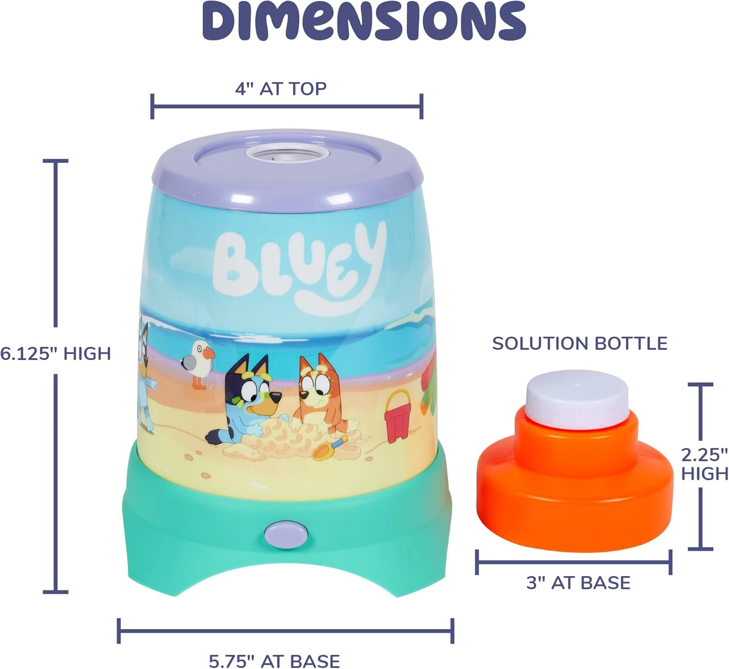 INCLUDES: Bluey Cyclone No Spill Bubble Machine and 4 fl oz of premium non poisonous bubble resolution. Requires 3 “AA” (1.5V) batteries, not included.