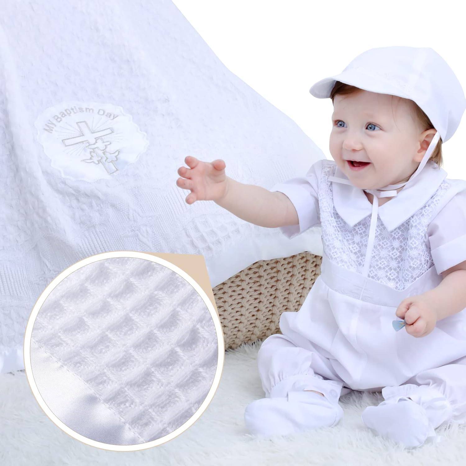The white child blankets unisex manufactured from acrylic and extensive satin border. (Essential Shell: 100% Acrylic+Border: 100% Nylon -Satin), It might carry a snug temperature to baby who’s being baptized and match the baptism outfits for boys or women.