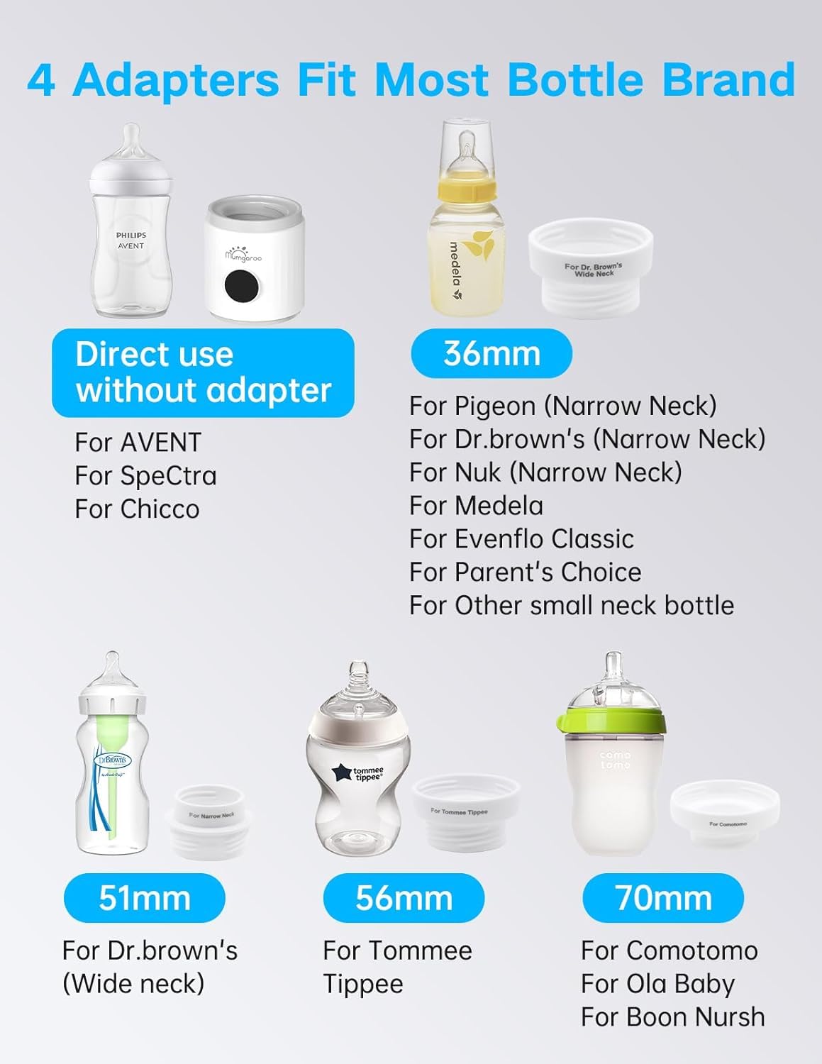 【A number of Adapters Match Most Bottles】Mumgaroo child bottle hotter is provided with 4 adapters, which might completely match most manufacturers of child bottles, suitable with AVENT, NUK, Dr.brown’s, Comotomo, Tommee Tippee, and so forth., please verify the listing of suitable feeding bottles or match the corresponding bottle mouth diameter to make sure compatibility along with your bottle. Mumgaroo bottle hotter is the proper child bathe reward and go-to selection on the go.