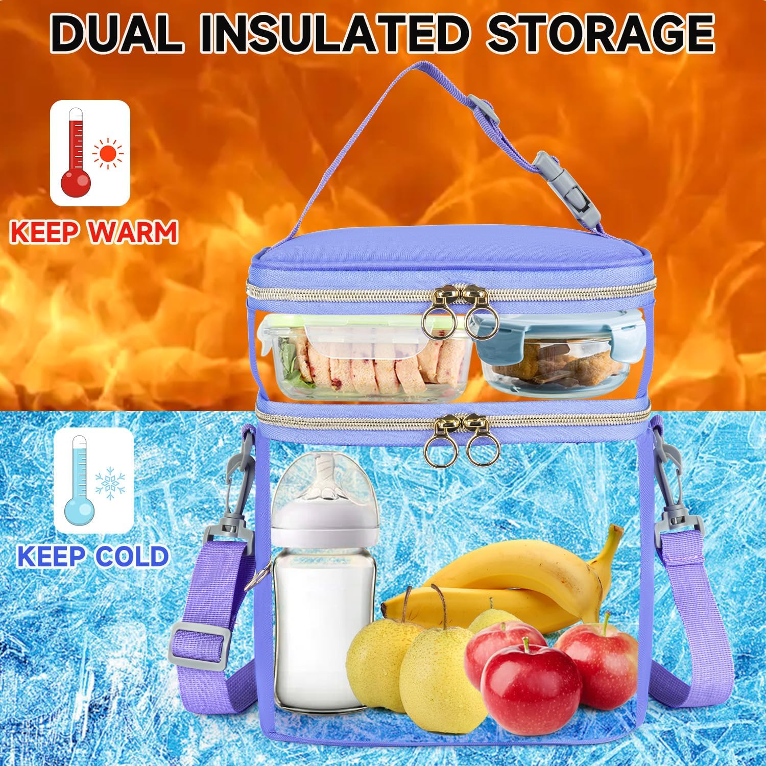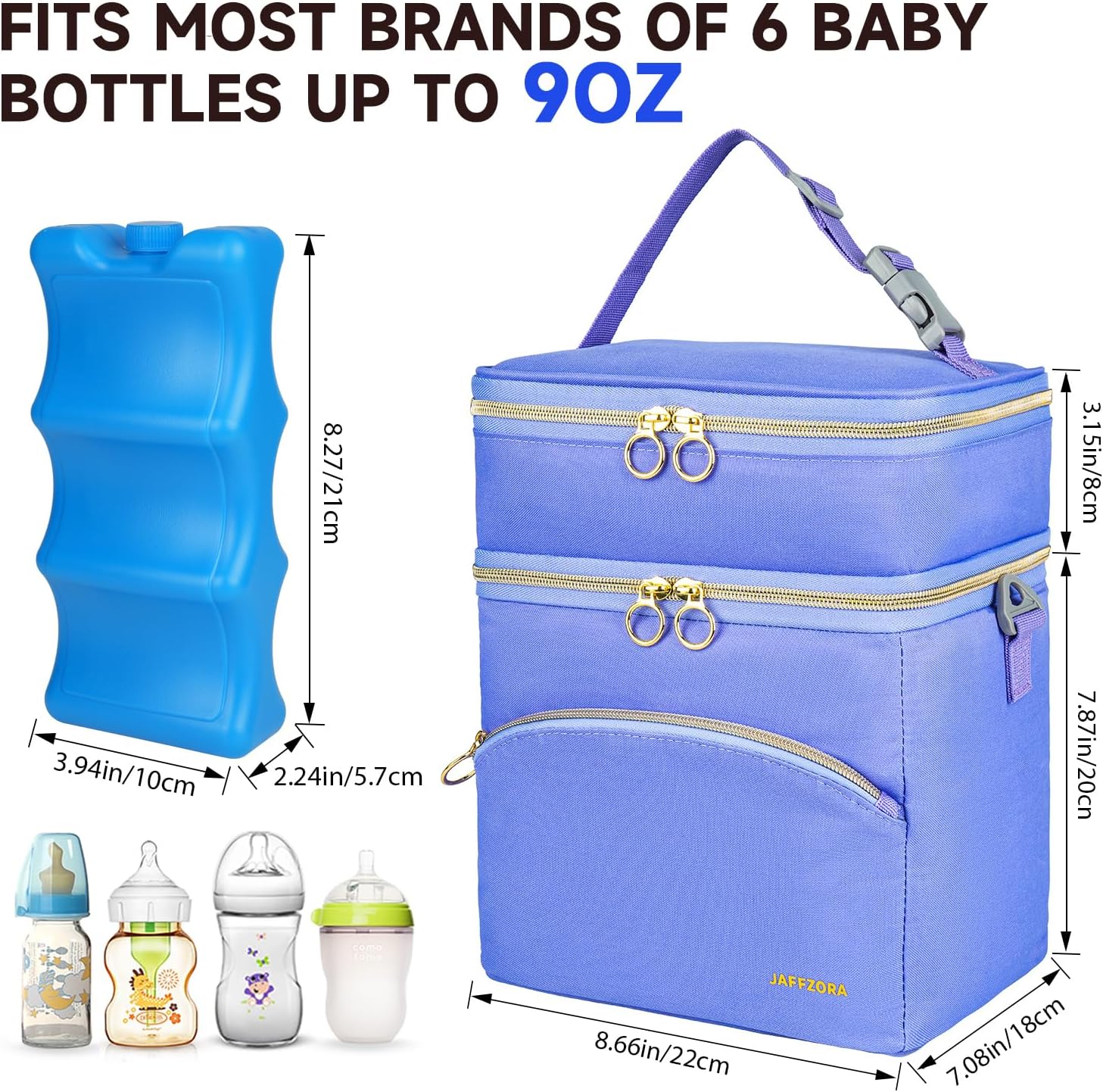 DOUBLE LAYER DESIGN: Th backside compartment can holds 6 child bottles as much as 9 ounces, matches many of the manufacturers child bottles. The entrance zipper pocket for storing cell phone, small equipment. The highest layer can retailer fruits, bread,and many others. And has a mesh pocket for small wipes, tissues, and many others.