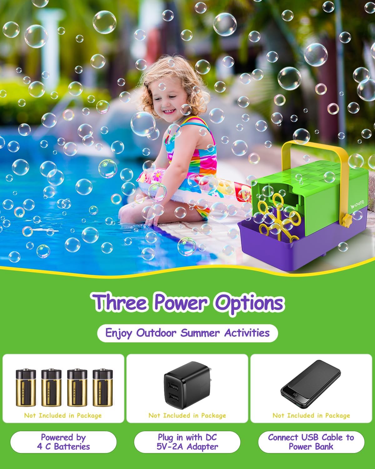 Versatile Energy Provide for Any Event: Operated by 4 C batteries (not included) for portability, a 5V/2A adapter(not included) for continuous indoor occasions, or any USB energy financial institution(not included) for outside use. This battery-operated / plug-in bubble machine can present most comfort for you. By no means miss magical moments at picnics, tenting journeys, or yard playdates.