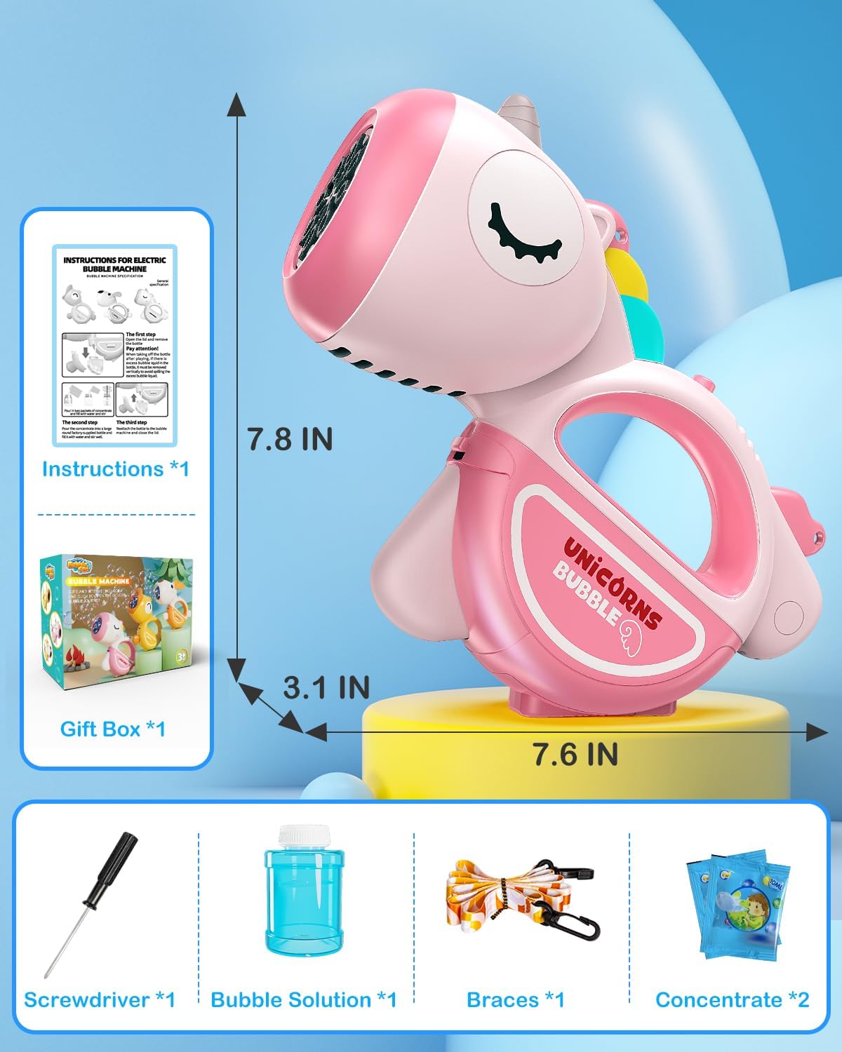 Buyer Satisfaction: Contains bubble maker machine, bubble answer, two refills, a strap, screwdriver, and charging cable. If it doesn’t meet your expectations, contact us by “contact sellers” for help