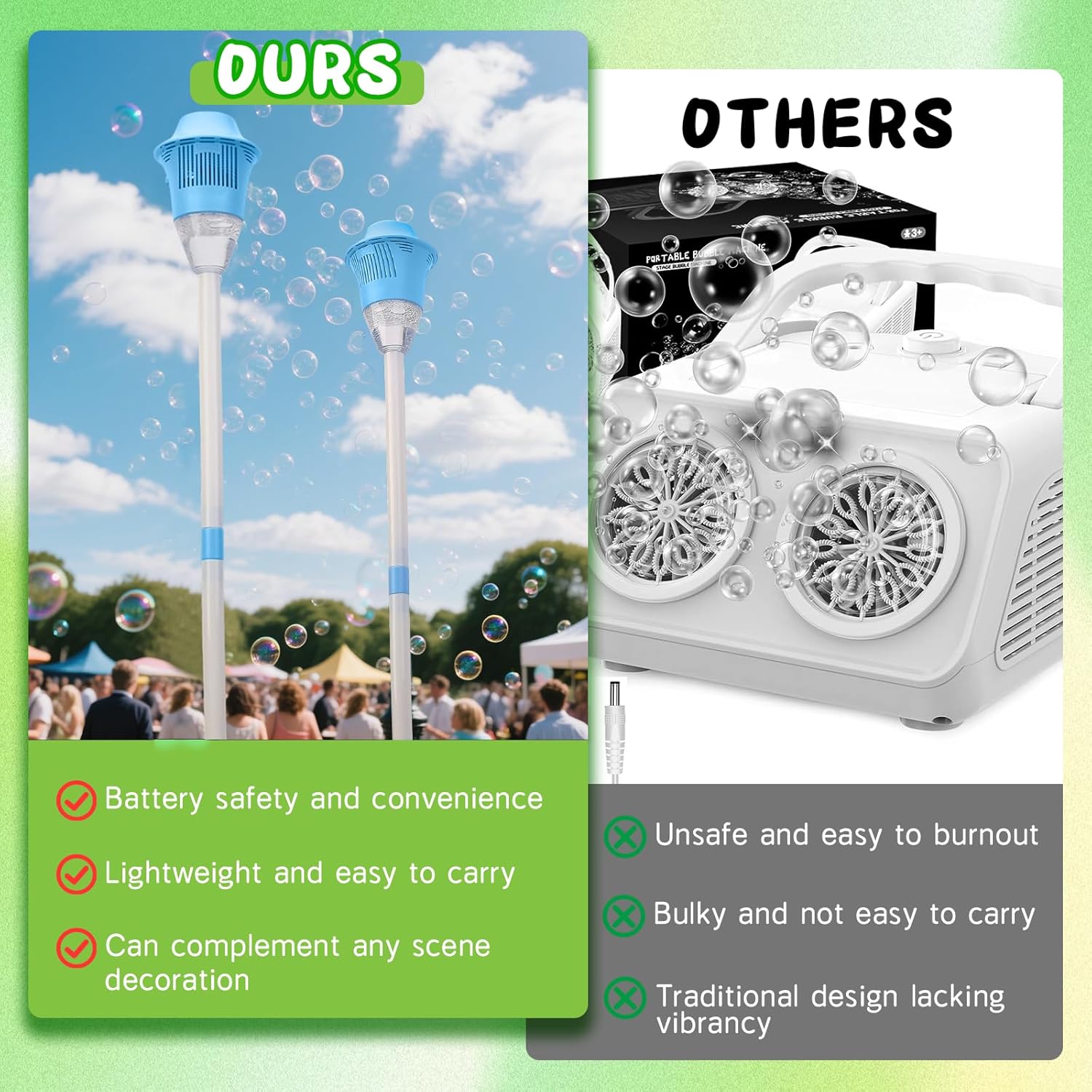💡【Tip】This product incorporates bubble liquid. Please use an expert bubble liquid after utilizing up the one supplied. If the quantity of bubbles produced is just too low, attempt a extra concentrated bubble resolution till the specified impact is achieved. Please clear the bubble outlet well timed after use