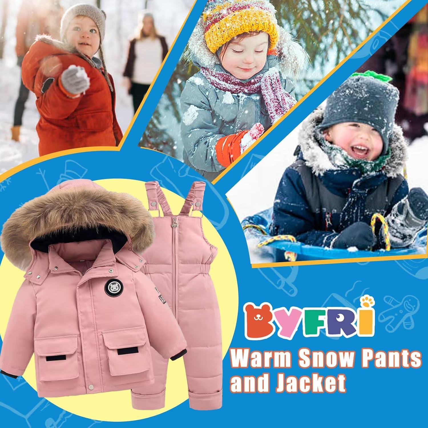 BYFRI children snow go well with set with prime quality supplies. The anti-pinch zipper prevents unintended scratches. The nice and cozy Hooded designed with detechable fur trim, make child hold heat.