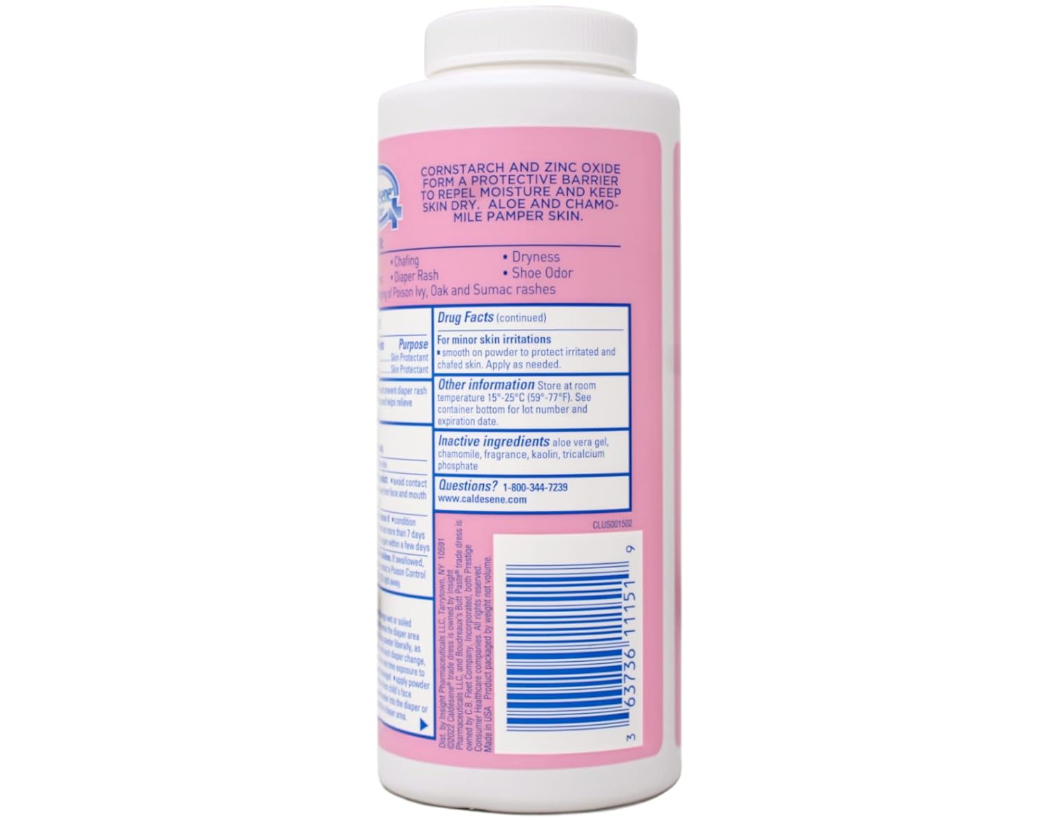 Caldesene Medicated Defending Physique Powder is talc-free and made with zinc oxide, aloe, and chamomile to pamper pores and skin